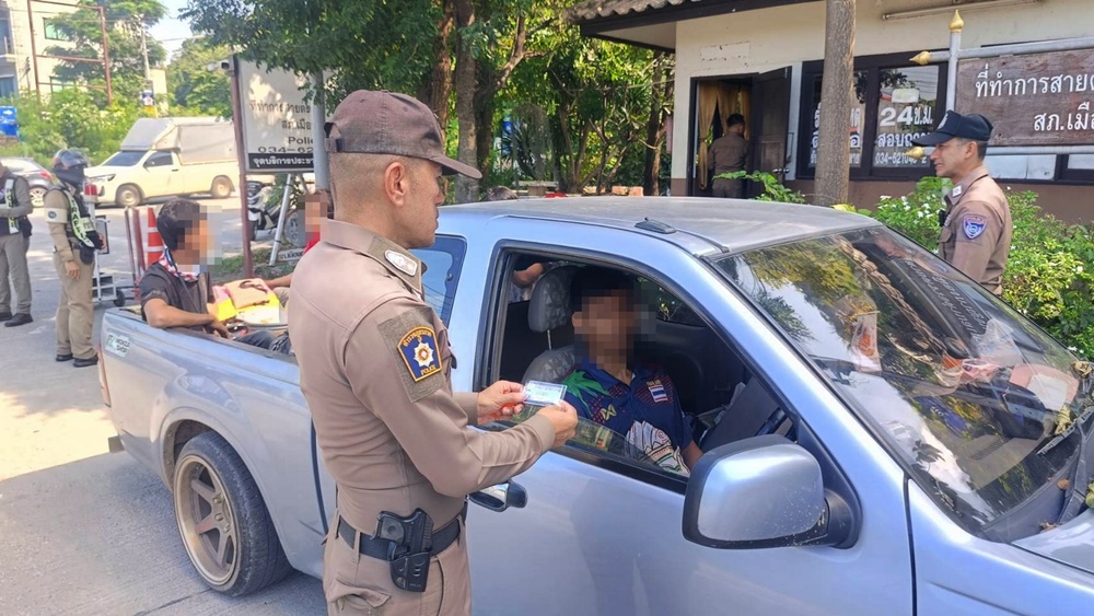 ระหว่างนั้นเจ้าหน้าที่พบรถยนต์กระบะยี่ห้ออีซูซุ แคป สีบอรนซ์เงิน หมายเลขทะเบียน นครปฐม ขับออกมาจากถนนเรียบแม่น้ำแม่กลองเพื่อมุ่งหน้าไปทางอำเภอด่านมะขามเตี้ย โดยมีผู้โดยสารเป็นชาย 1 ราย หญิง 3 รายนั่งกินลมอยู่ที่กระบะท้ายแบบชิลล์ๆ เมื่อมาถึงด่านเจ้าหน้าที่จราจร สภ.เมืองกาญจนบุรีจึงเรียกให้คนขับชะลอเลี้ยวเข้าไปชิดซ้ายริมถนน เพื่อขอตรวจเอกสารใบขับขี่