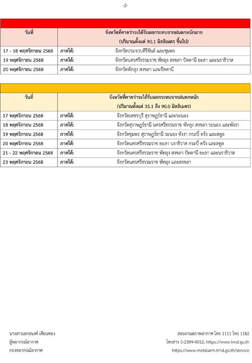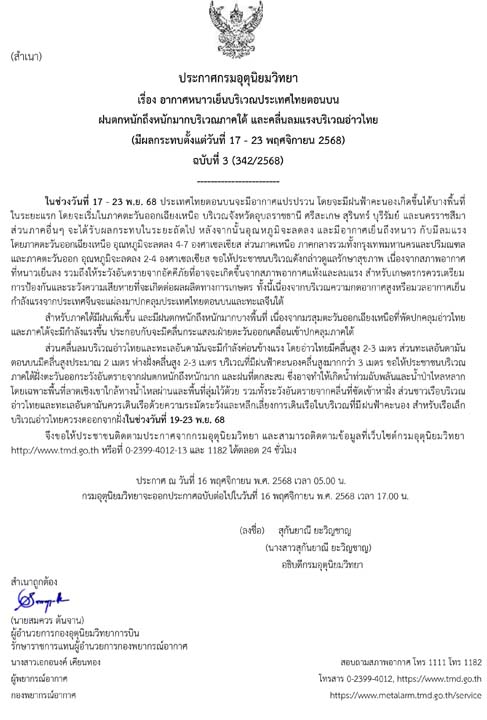 เมื่อเวลา 05.00 น.วันที่ 16 พฤศจิกายน 2568 กรมอุตุนิยมวิทยา ออกประกาศเรื่อง “อากาศหนาวเย็นบริเวณประเทศไทยตอนบน ฝนตกหนักถึงหนักมากบริเวณภาคใต้ และคลื่นลมแรงบริเวณอ่าวไทย (มีผลกระทบตั้งแต่วันที่ 17 - 23 พฤศจิกายน 2568) ฉบับที่ 3”