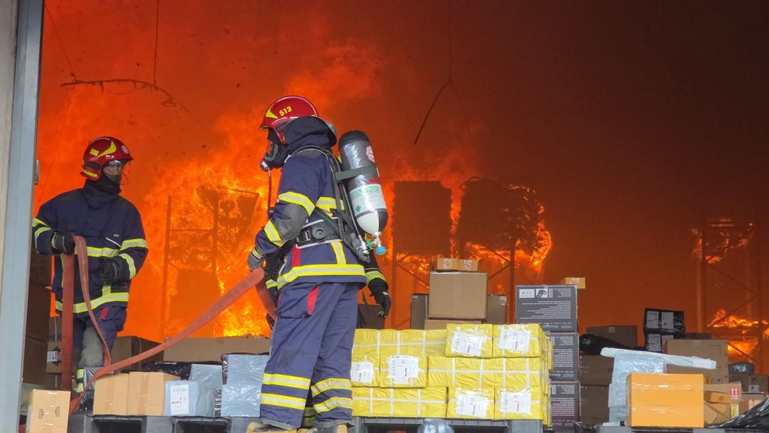 ซึ่งไฟได้โหมลุกลามไหม้สิ่งของเครื่องใช้ภายในโกดังจนวอดเกือบหมดอีกทั้งโครงหลังคาพร้อมชิ้นส่วนได้ถล่มลงมาเป็นระยะเจ้าหน้าที่ต้องกันผู้ไม่เกี่ยวข้องออกมาเกรงจะเกิดอันตราย