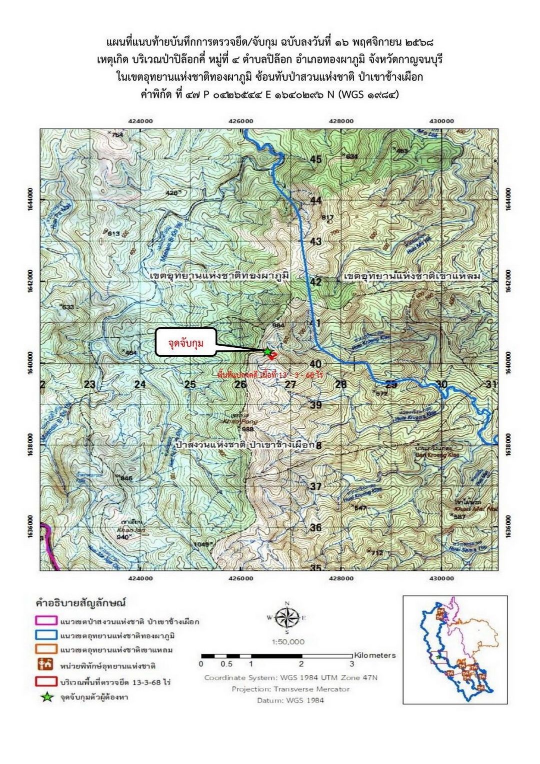 จากการตรวจสอบภาพพบกลุ่มบุคคลเป็นชายประมาณ 15 ราย มีทั้งอาวุธปืนยาวและอาวุธปืนพกสั้น เดินเท้าเข้าไปในพื้นที่ป่าปิล๊อกคี่ ในเขตอุทยานแห่งชาติทองผาภูมิ และป่าสงวนแห่งชาติป่าเขาช้างเผือก เพื่อลักลอบขุดดินร่อนหาแร่ทองคำในพื้นที่แปลงตรวจยึดเนื้อที่ 13-3-68 ไร่