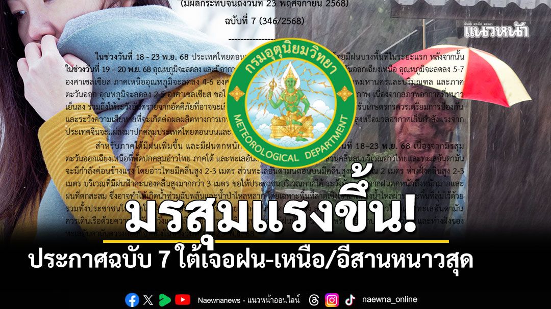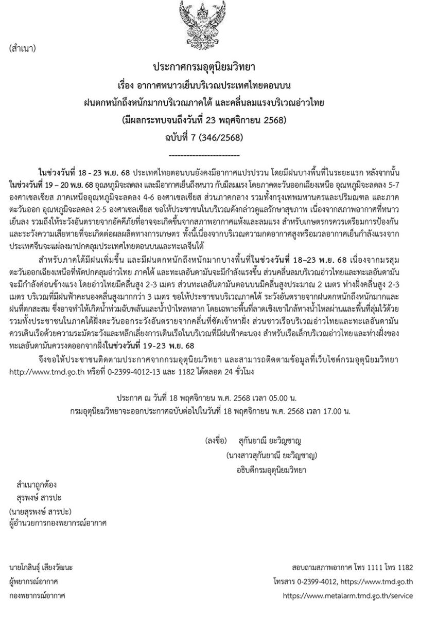 กรมอุตุนิยมวิทยา ประกาศเรื่อง อากาศหนาวเย็นบริเวณประเทศไทยตอนบน ฝนตกหนักถึงหนักมากบริเวณภาคใต้ และคลื่นลมแรงบริเวณอ่าวไทย (มีผลกระทบจนถึงวันที่ 23 พฤศจิกายน 2568) ฉบับที่ 7