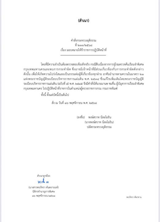 ผู้สื่อข่าวรายงานจากกระทรวงยุติธรรม (ยธ.) ว่า เมื่อวันที่16 พฤศจิกายน 2568 มีหนังสือคำสั่ง กระทรวงยุติธรรมที่ 233/2568 ลงนามโดยพงษ์สวาท นีละโยธิน ปลัดกระทรวงยุติธรรม เรื่อง “มอบหมายให้ข้าราชการปฏิบัติหน้าที่”