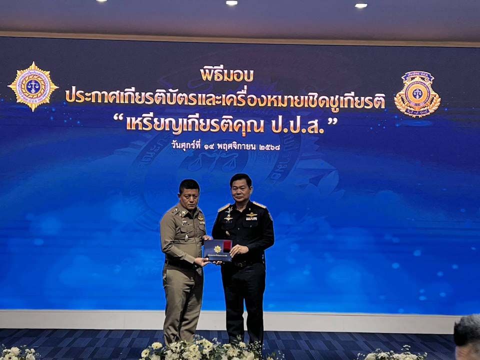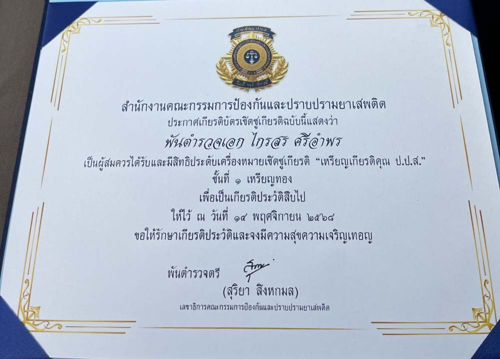 ต่อมาวันที่ 14 พ.ย.68 พ.ต.อ.ไกรสร ศรีอำพร ผกก.สส.ภ.จว.สระบุรี เข้ารับมอบเครื่องหมายเชิดชูเกียรติ “เหรียญเกียรติคุณ ป.ป.ส.” ชั้นที่หนึ่ง (เหรียญทอง) สำหรับผู้ที่มีผลงานยอดเยี่ยมจาก พ.ต.ต.สุริยา สิงหกมล เลขาธิการ ป.ป.ส.