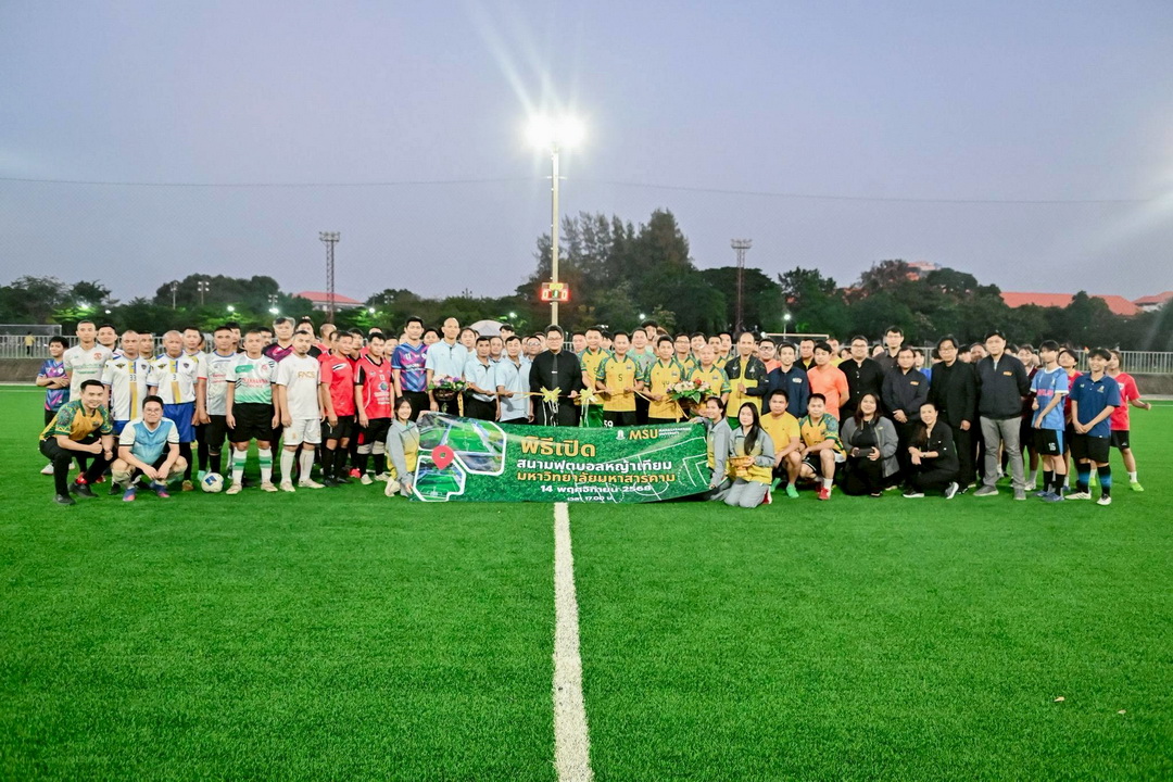 รศ.ดร.ประยุกต์ ศรีวิไล อธิการบดีมหาวิทยาลัยมหาสารคาม เป็นประธานในพิธีเปิดสนามฟุตบอลหญ้าเทียมแห่งใหม่ เดินหน้าสู่ “มหาวิทยาลัยสุขภาพ” โดยมี อาจารย์ ดร.วัฒนพงษ์ คงสืบเสาะ ผู้ช่วยอธิการบดีฝ่ายส่งเสริมสุขภาพและพัฒนาการกีฬา นำคณาจารย์และนิสิตร่วมกิจกรรมในโอกาสเปิดใช้งานสนามฟุตบอลหญ้าเทียม มหาวิทยาลัยมหาสารคาม (เขตพื้นที่ขามเรียง) เป็นวันแรก