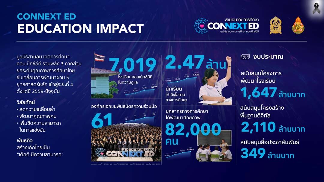 จากจุดเริ่มต้นของความร่วมมือในปี 2559 ปัจจุบัน มีองค์กรเอกชนพันธมิตรกว่า 61 องค์กร มีโรงเรียนคอนเน็กซ์อีดีที่อยู่ในสังกัด สพฐ.จำนวน 7,019 แห่งทั่วประเทศ มีนักเรียนที่ได้รับการสนับสนุนด้านการศึกษาสะสมแล้วกว่า 2.47 ล้านคน ขณะที่มีผู้นำรุ่นใหม่ (School Partner) จำนวน 2,145 คน ร่วมพัฒนาโรงเรียน พร้อมด้วย ICT Talent อีก 6,700 คน เพื่อเสริมทักษะดิจิทัลและเอไอ ครอบคลุมในระดับพื้นที่ อีกทั้งยังพัฒนาศักยภาพบุคลากรทางการศึกษากว่า 82,000 คน ทำให้ครู 76% ใช้เทคโนโลยีในการสอนมากขึ้น และจัดตั้งศูนย์การเรียนรู้ Learning Center ในโรงเรียนกว่า 2,000 แห่ง และได้จัดสรรคอมพิวเตอร์โน้ตบุ๊คและอุปกรณ์การเรียนรู้ดิจิทัล พร้อมการอบรมการประยุกต์ใช้เทคโนโลยีและเอไอเพื่อการเรียนการสอนแก่ครูและนักเรียน รวมมูลค่ากว่า 115 ล้านบาท ทำให้ครูและนักเรียนมีทักษะ Digital & Computer Literary เพิ่มขึ้น 75% โดยผลการดำเนินงานของมูลนิธิฯ ได้สร้างผลลัพธ์อย่างเป็นรูปธรรม สอดคล้องตามกลไก 5 ยุทธศาสตร์หลัก ผ่านความร่วมมือในการดำเนินงานของ 5 คณะทำงาน ภาครัฐ-เอกชน ที่มาช่วยเสริมแกร่งให้เป็นไปตามเป้าหมายของมูลนิธิฯ ได้แก่