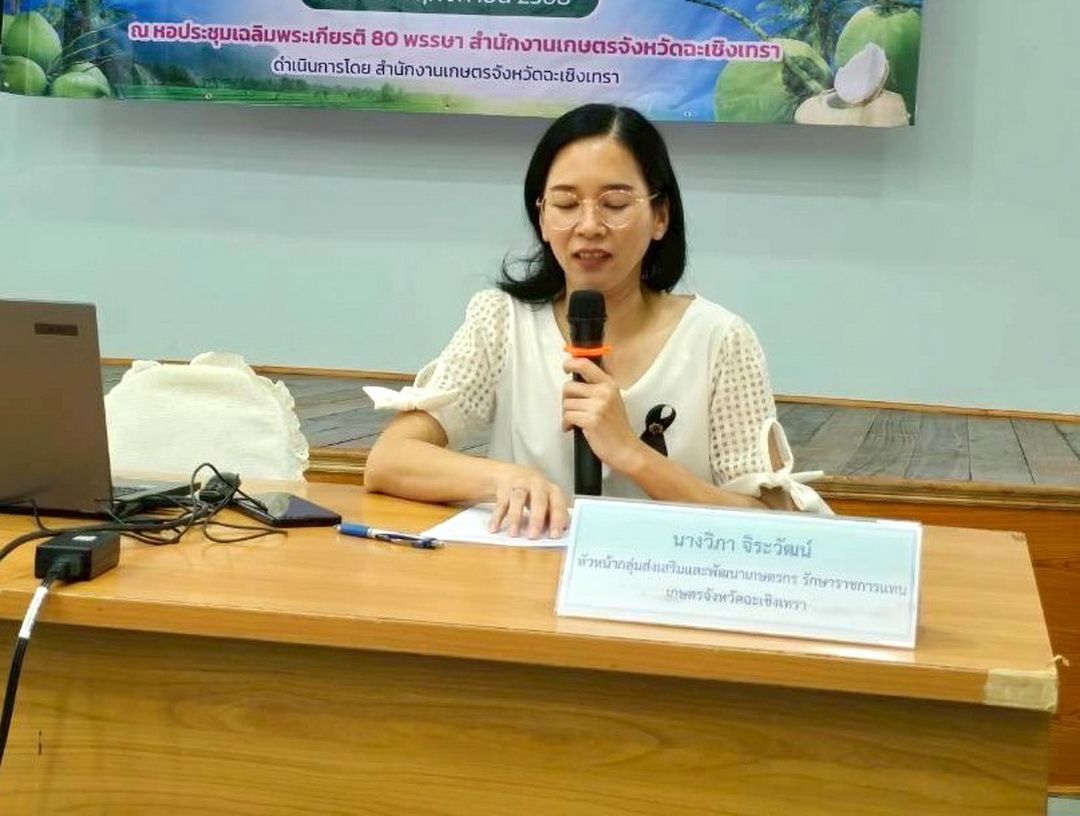 ผู้สื่อข่าวรายงานว่า ที่หอประชุมเฉลิมพระเกียรติ 80 พรรษา สำนักงานเกษตรจังหวัดฉะเชิงเทรา นางวิภา จิระวัฒน์ หัวหน้ากลุ่มส่งเสริมและพัฒนาเกษตรกร รักษาราชการแทนเกษตรจังหวัดฉะเชิงเทรา เป็นประธานเปิดโครงการกิจกรรมถ่ายทอดความรู้การพัฒนาการผลิตมะพร้าวน้ำหอมที่มีคุณภาพตามระบบมาตรฐาน GAP (Good Agricultural Practice)