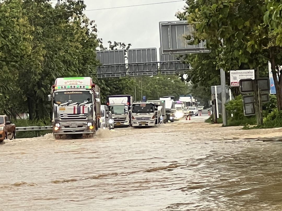 มวลน้ำได้ไหลหลากเข้าท่วม ถนนสายเอเชีย บริเวณสี่แยกโพธิ์ทอง ฝั่งขาขึ้น โดยระดับน้ำสูงประมาณครึ่งเลน ส่งผลให้รถทุกชนิดต้องชะลอความเร็วเพื่อใช้เส้นทางด้วยความระมัดระวัง นอกจากนี้ถนนทางเข้าตัวอำเภอควนขนุนจากสี่แยกโพธิ์ทอง ก็มีน้ำท่วมขังยาวประมาณ 1 กิโลเมตร แม้จะยังสัญจรได้ แต่ต้องใช้ความระมัดระวังเป็นพิเศษ