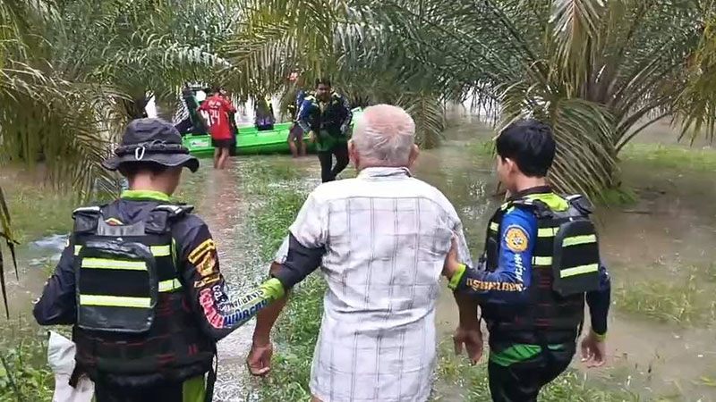 เจ้าหน้าที่กู้ภัยตรังเร่งระดมกำลังและเรือท้องแบนฝ่าน้ำเชี่ยว เข้าช่วยผู้สูงอายุที่ติดอยู่ในบ้านกลางสวนปาล์ม วัย 80 ปี ขณะสถานการณ์น้ำท่วมขยายวงกว้าง 9 อำเภอ กระทบแล้วเกือบ 7,000 ครัวเรือน