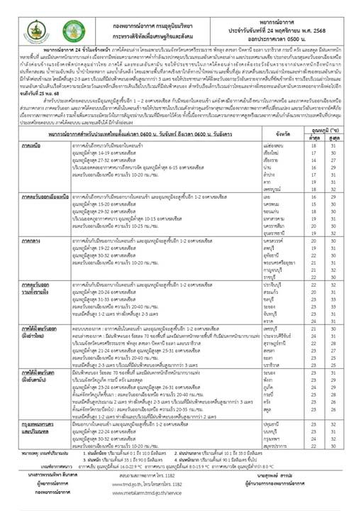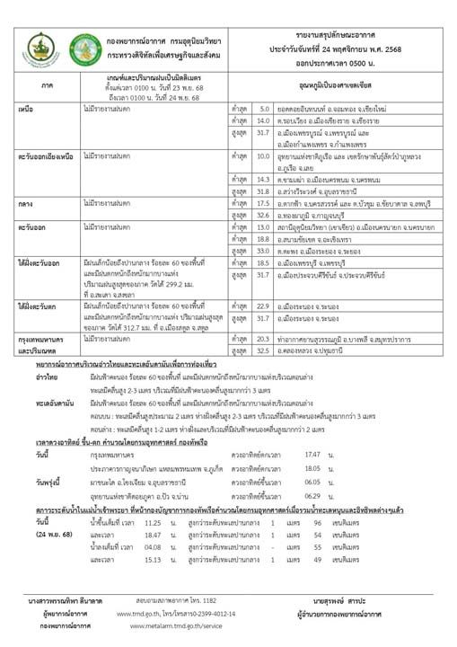 24 พฤศจิกายน 2568 กรมอุตุนิยมวิทยา รายงานลักษณะอากาศทั่วไป พยากรณ์อากาศ 24 ชั่วโมงข้างหน้า ภาคใต้ตอนล่าง โดยเฉพาะบริเวณจังหวัดนครศรีธรรมราช พัทลุง สงขลา ปัตตานี ยะลา นราธิวาส กระบี่ ตรัง และสตูล มีฝนตกหนักหลายพื้นที่ และมีฝนตกหนักมากบางแห่ง เนื่องจากมีหย่อมความกดอากาศต่ำกำลังแรงปกคลุมบริเวณทะเลอันดามันตอนล่าง และประเทศมาเลเซีย ประกอบกับมรสุมตะวันออกเฉียงเหนือกำลังค่อนข้างแรงยังคงพัดปกคลุมอ่าวไทย ภาคใต้ และทะเลอันดามัน ขอให้ประชาชนในภาคใต้ตอนล่างยังคงต้องระวังอันตรายจากฝนตกหนักถึงหนักมาก ฝนที่ตกสะสม น้ำท่วมฉับพลัน น้ำป่าไหลหลาก และน้ำล้นตลิ่ง โดยเฉพาะพื้นที่ลาดเชิงเขาใกล้ทางน้ำไหลผ่านและพื้นที่ลุ่ม