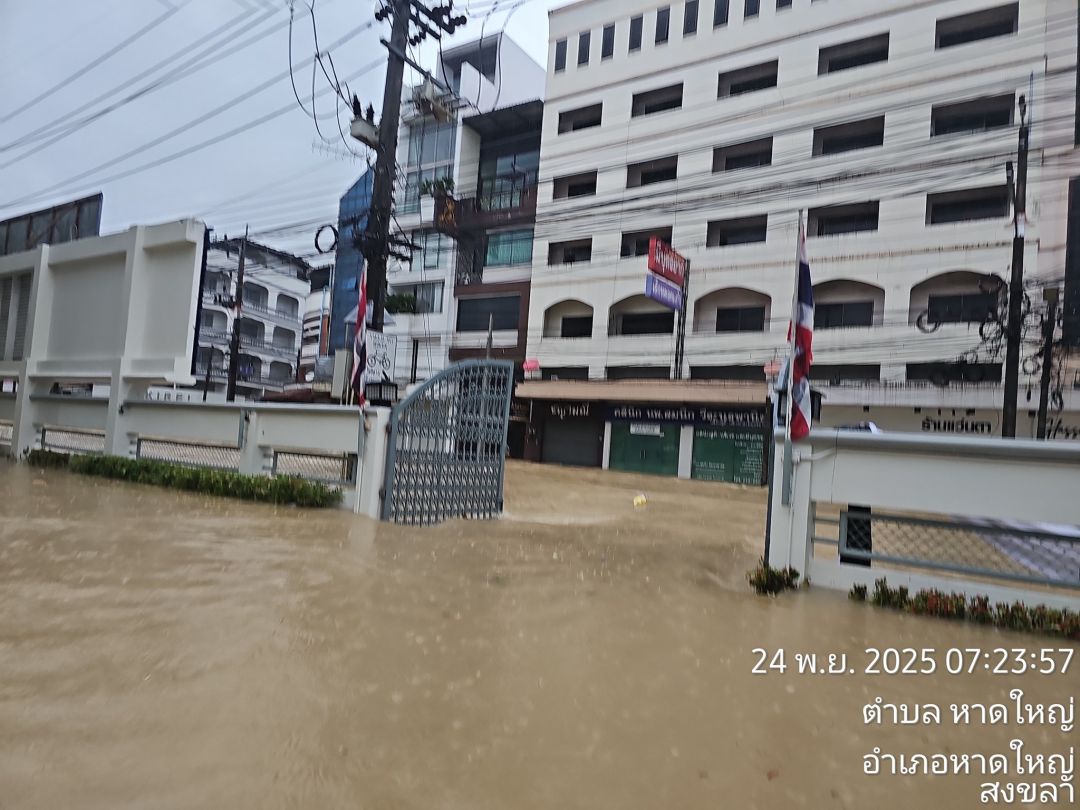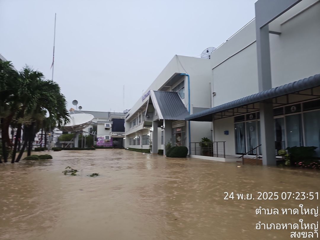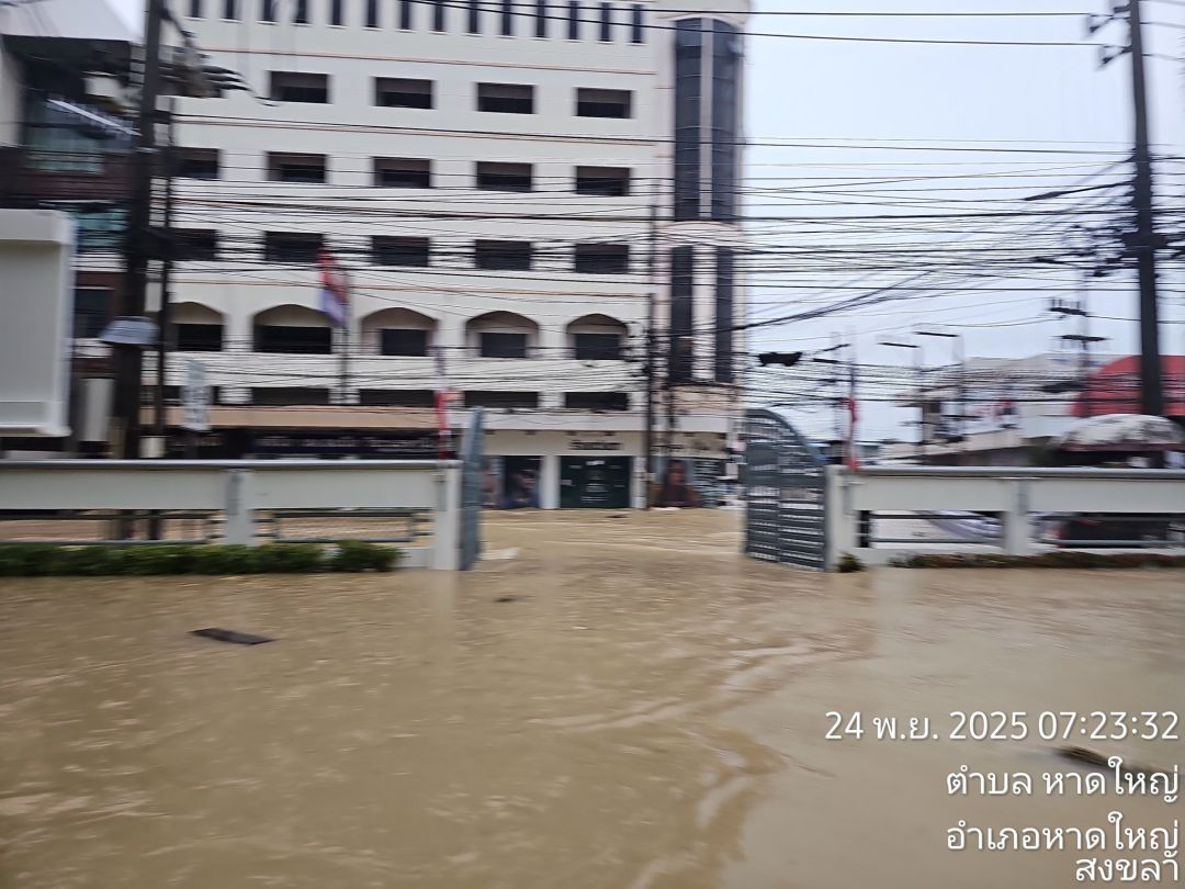 เมื่อวันที่ 24 พ.ย.2568 เพจเฟซบุ๊ก "สำนักประชาสัมพันธ์เขต 6 กรมประชาสัมพันธ์" ได้โพสต์ภาพระดับน้ำล่าสุดช่วงเวลา 07.31 น. บริเวณบริเวณสี่แยกไฟแดงไปรษณีย์ ถนนนิพัทธ์สงเคราะห์ อ.หาดใหญ่ จ.สงขลา โดยระบุข้อความว่า "ปริมาณน้ำล่าสุด 24 พฤศจิกายน 2568 เวลา 07.31 น. บริเวณสี่แยกไฟแดงไปรษณีย์ ถนนนิพัทธ์สงเคราะห์ 1 ระดับน้ำเพิ่มสูงขึ้น เนื่องจากมวลน้ำมหาศาล ไหลจากอำเภอสะเดา สู่คลองอู่ตะเภาและ ร. 1 ล้นทะลักออกมา ขณะนี้ วิกฤติขั้นสูงสุด"