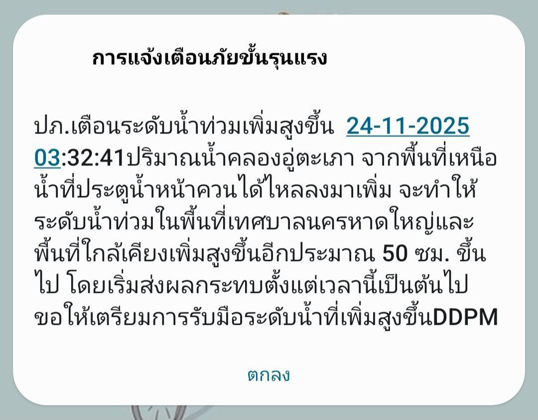 ขณะที่กรมป้องกันและบรรเทาสาธารณภัย (ปภ.) ได้ส่งข้อความแจ้งเตือนภัยขั้นรุนแรง เมื่อเวลา 03.32 น. โดยระบุข้อความว่า "ปภ.เตือนระดับน้ำท่วมเพิ่มสูงขึ้น 24-11-2025 03:32:41ปริมาณน้ำคลองอู่ตะเภา จากพื้นที่เหนือ น้ำที่ประตูน้ำหน้าควนได้ไหลลงมาเพิ่ม จะทำให้ระดับน้ำท่วมในพื้นที่เทศบาลนครหาดใหญ่และพื้นที่ใกล้เคียงเพิ่มสูงขึ้นอีกประมาณ 50 ชม. ขึ้นไป โดยเริ่มส่งผลกระทบตั้งแต่เวลานี้เป็นต้นไป ขอให้เตรียมการรับมือระดับน้ำที่เพิ่มสูงขึ้นDDPM"