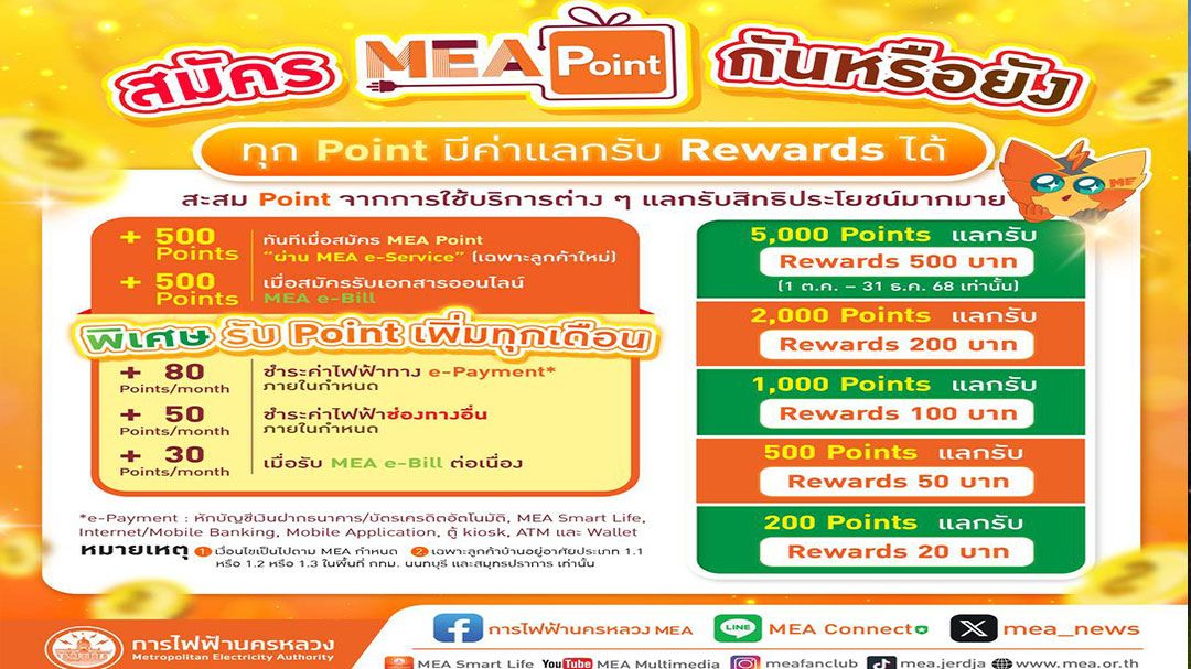 สำหรับผู้สนใจเข้าร่วมโครงการฯ ที่ยังไม่เคยลงทะเบียนใช้งาน MEA e-Service และสมัครใช้บริการ MEA e-Bill เพื่อลดการใช้กระดาษมาก่อน เมื่อลงทะเบียนใช้งาน MEA e-Service พร้อมยืนยันตัวตน และสมัครใช้บริการ MEA e-Bill เรียบร้อยแล้ว จะได้รับ MEA Point จำนวน 1,000 Points ซึ่งสามารถนำไปแลกรับ Rewards ได้ตามเงื่อนไขที่ MEA กำหนด (รายละเอียดของ MEA Point และ Rewards ตรวจสอบได้จาก Infographic ท้ายข่าว)