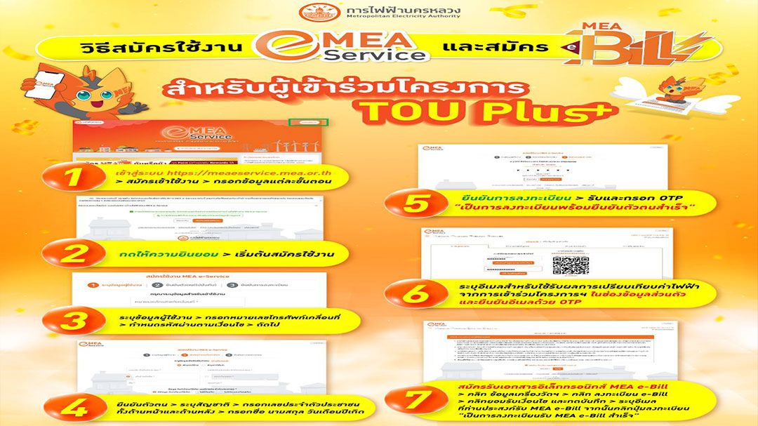 เพื่อสนับสนุนนโยบายรัฐบาลด้านการลดค่าไฟฟ้าให้ประชาชน MEA เปิดรับสมัครผู้เข้าร่วมโครงการ “TOU Plus” จำนวน 2,000 ราย เพื่อรับการติดตั้งเครื่องวัดหน่วยไฟฟ้าอัตรา TOU สำหรับทดลองเปรียบเทียบความแตกต่างของค่าไฟฟ้าระหว่างการใช้ไฟฟ้าภายใต้อัตราปกติ (อัตรา 1.2) และอัตรา TOU (อัตรา 1.3) โดยยังไม่ต้องเสียค่าใช้จ่ายในการเปลี่ยนเครื่องวัดหน่วยไฟฟ้า และ MEA จะแจ้งผลการเปรียบเทียบค่าไฟฟ้าจำนวน 3 รอบบิล ให้ผู้เข้าร่วมโครงการฯ