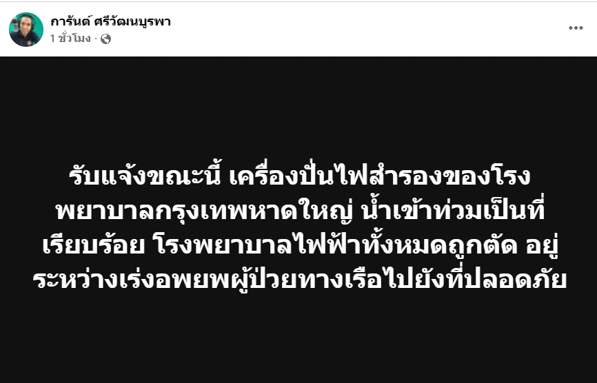 24 พ.ย.68 สถานการณ์น้ำท่วมในพื้นที่อำเภอหาดใหญ่ จังหวัดสงขลา ยังคงอยู่ในภาวะวิกฤต ล่าสุดมีรายงานด่วนจากผู้ใช้เฟซบุ๊กชื่อ การันต์ ศรีวัฒนบูรพา ว่า เครื่องปั่นไฟสำรองของโรงพยาบาลกรุงเทพหาดใหญ่ถูกน้ำเข้าท่วมเสียหาย ส่งผลให้ระบบไฟฟ้าของโรงพยาบาลถูกตัดขาดทั้งหมด