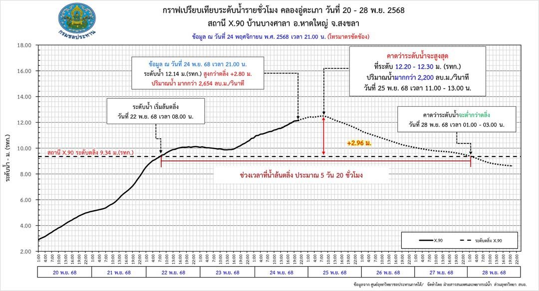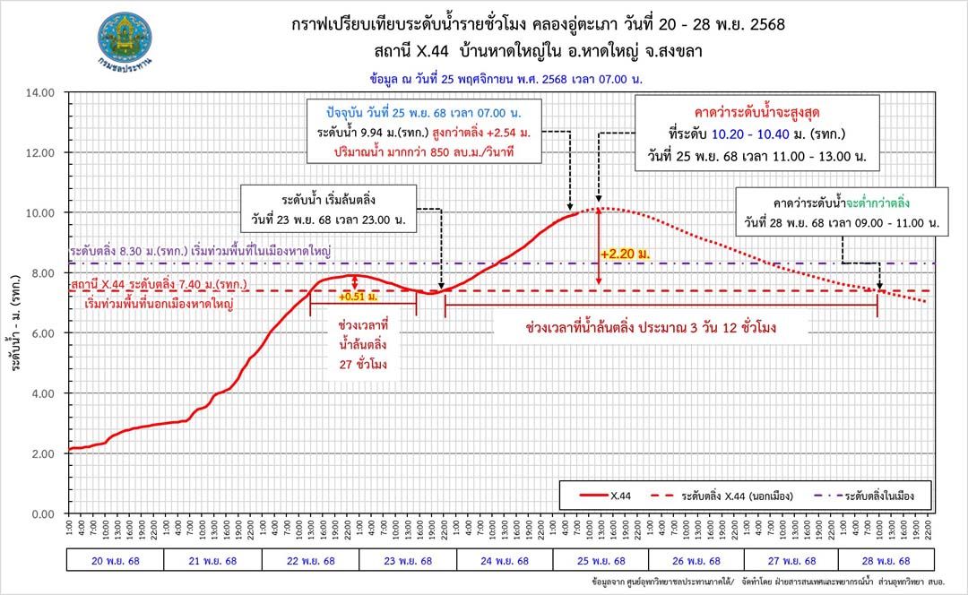 จากการประมวลผลข้อมูลร่วมกับกรมชลประทาน พบว่า ระดับน้ำจะทยอยเพิ่มสูงขึ้นตั้งแต่ต้นน้ำลงมาถึงพื้นที่ตอนกลางและตอนล่าง โดยคาดว่า บริเวณสถานี X.44 อ.หาดใหญ่ จะมีระดับน้ำขึ้นสูงสุดในช่วงเวลา 11.00 - 13.00 น.วันนี้ (25 พ.ย.) จากนั้นจะเริ่มทรงตัวและค่อยๆ ลดลง หากไม่มีฝนตกหนักเพิ่ม โดยกรมอุตุนิยมวิทยาคาดการณ์ด้วยว่า ปริมาณฝนตั้งแต่วันที่ 26 พ.ย.เป็นต้นไปจะลดลง