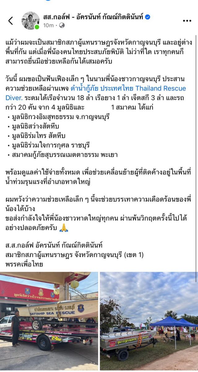 ส.ส.กอล์ฟ ระบุว่า ‘แม้ว่าผมจะเป็นสมาชิกสภาผู้แทนราษฎรจังหวัดกาญจนบุรี และอยู่ต่างพื้นที่กัน แต่เมื่อพี่น้องคนไทยประสบภัยพิบัติ ไม่ว่าที่ใด เราทุกคนก็สามารถยื่นมือช่วยเหลือกันได้เสมอครับ’