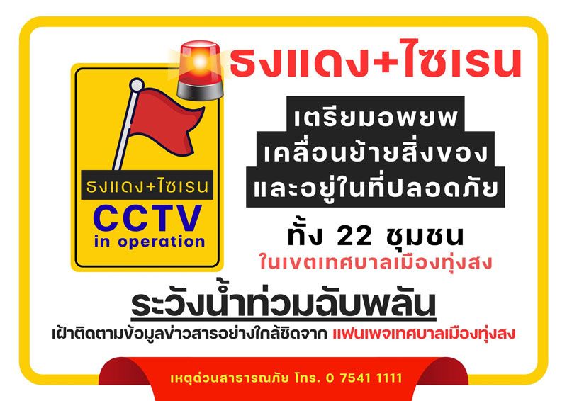 25 พ.ย. 68 เทศบาลเมืองทุ่งสง จ.นครศรีธรรมราช เเจ้งสถานการณ์น้ำในเขตเทศบาลเมืองทุ่งสง ได้ประกาศยกธงแดงบวกเสียงไซเรน คาดการณ์มวลน้ำจากต้นน้ำจะไหลเข้าสู่พื้นที่เทศบาลเมืองทุ่งสง ประมาณ 17.00 น. อาจเกิดน้ำท่วมฉับพลัน ให้เตรียมอพยพ เคลื่อนย้ายสิ่งของ และย้ายไปอยู่ในที่ปลอดภัยทันที