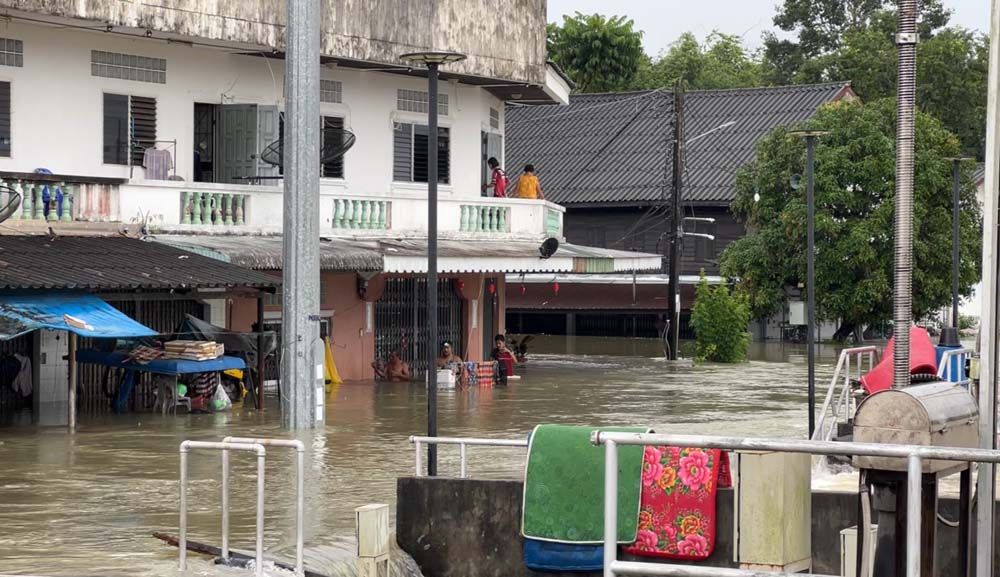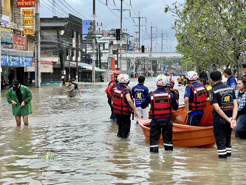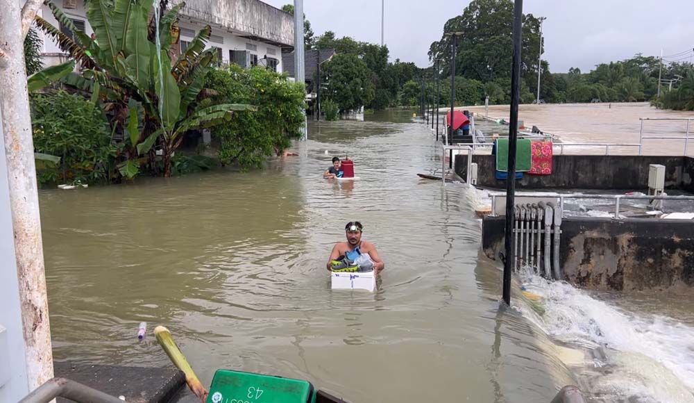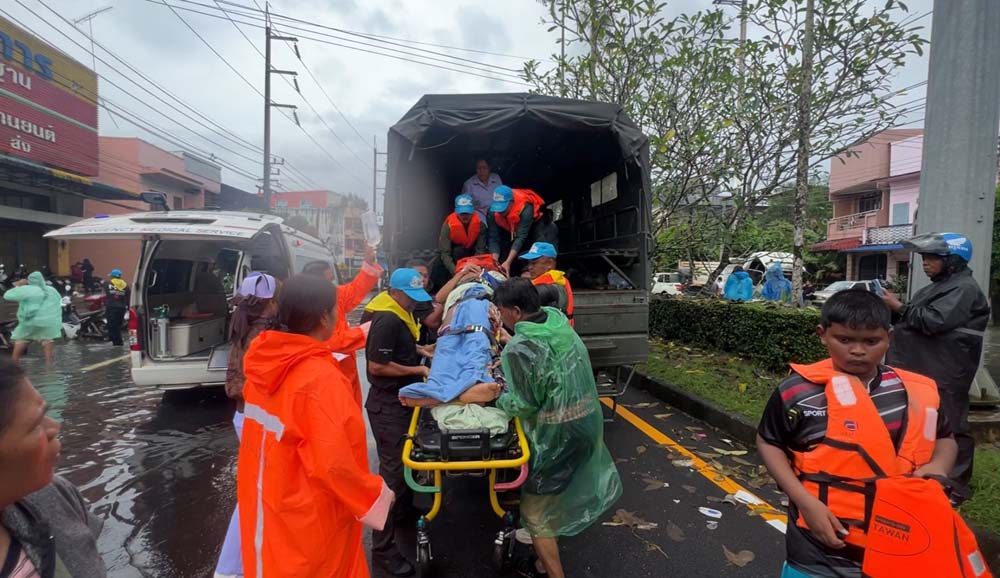 น้ำป่า-น้ำฝน ถล่มย่านตาขาว หนักสุดในรอบ 15 ปี เร่งอพยพชาวบ้านหนีน้ำ จนท.แบกผู้สูงอายุ-สัตว์เลี้ยง ช่วยผู้ป่วยติดเตียงออกจากบ้านจม 3 เมตร ถนนตรัง-ปะเหลียนสูง 1.5 เมตร รถเล็กสัญจรไม่ได้ ต้องใช้รถ 6 ล้อขึ้นไป ขณะทีมแพทย์ต้องเปลี่ยนถ่ายผู้ป่วยวิกฤตขึ้นรถทหาร ลุยมวลน้ำส่งต่อ รพ. จนท.เร่งเคลื่อนย้ายให้ครบก่อนถูกตัดไฟ คาดระดับน้ำยังเพิ่มต่อเนื่อง หลังฝายด้านบนฉีกขาด มวลน้ำทะลักลงพื้นที่เศรษฐกิจของอำเภอ