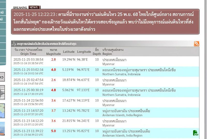 วันที่ 25 พฤศจิกายน 2568 กรมอุตุนิยมวิทยาแจง แผ่นดินไหว “หมู่เกาะสุมาตรา–อันดามัน” เป็นเหตุการณ์ปกติ ไม่ได้มีขนาดรุนแรงและไม่ใช่สิ่งบอกเหตุสึนามิ ย้ำกองเฝ้าระวังแผ่นดินไม่ได้แจ้งเตือน “รหัสแดง” ตามที่แชร์กัน เป็นการรายงานสถานการณ์ในแอปพลเคชัน ขอให้ประชาชนไม่ต้องตื่นตระหนก