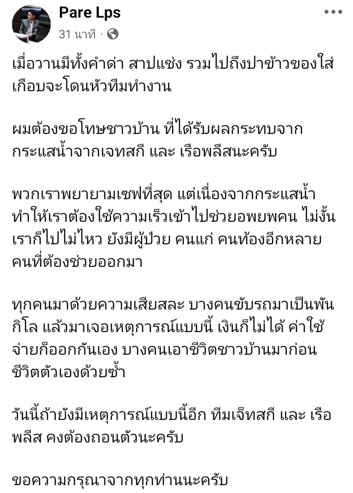 ผมต้องขอโทษชาวบ้าน ที่ได้รับผลกระทบจาก กระแสน้ำจากเจทสกี และ เรือพลีสนะครับ พวกเราพยายามเซฟที่สุด แต่เนื่องจากกระแสน้ำ ทำให้เราต้องใช้ความเร็วเข้าไปช่วยอพยพคน ไม่งั้นเราก็ไปไม่ไหว ยังมีผู้ป่วย คนแก่ คนท้องอีกหลายคนที่ต้องช่วยออกมา ครอบครัวผมก็ติดน้ำท่วมที่หาดใหญ่
