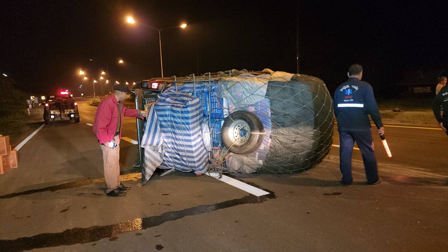 รถบรรทุกผลไม้ยางระเบิดคว่ำกลางโค้งน่าน โชคดีคนขับปลอดภัยไร้เจ็บ