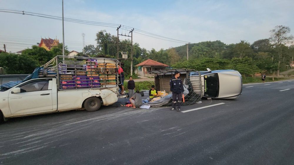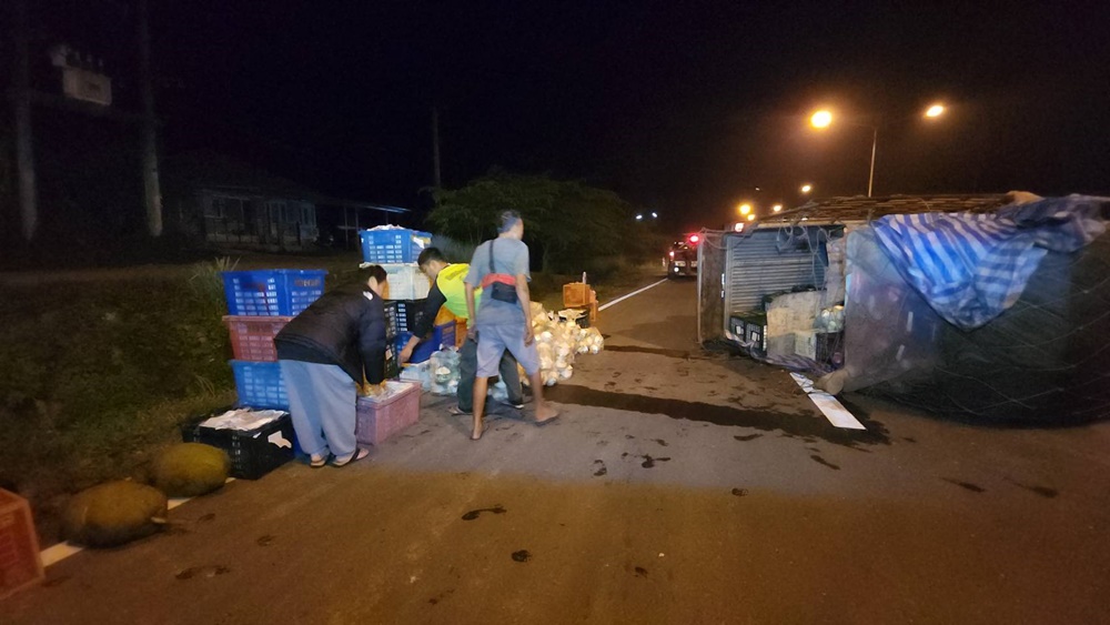 ในที่เกิดเหตุ เจ้าหน้าที่พบ รถบรรทุก 4 ล้อคอก ยี่ห้ออีซูซุ สีบรอนซ์ ทะเบียนน่าน พลิกตะแคงอยู่กลางถนน สภาพสินค้าเกษตร (ผลไม้รวม) ที่บรรทุกมาได้รับความเสียหายบางส่วน