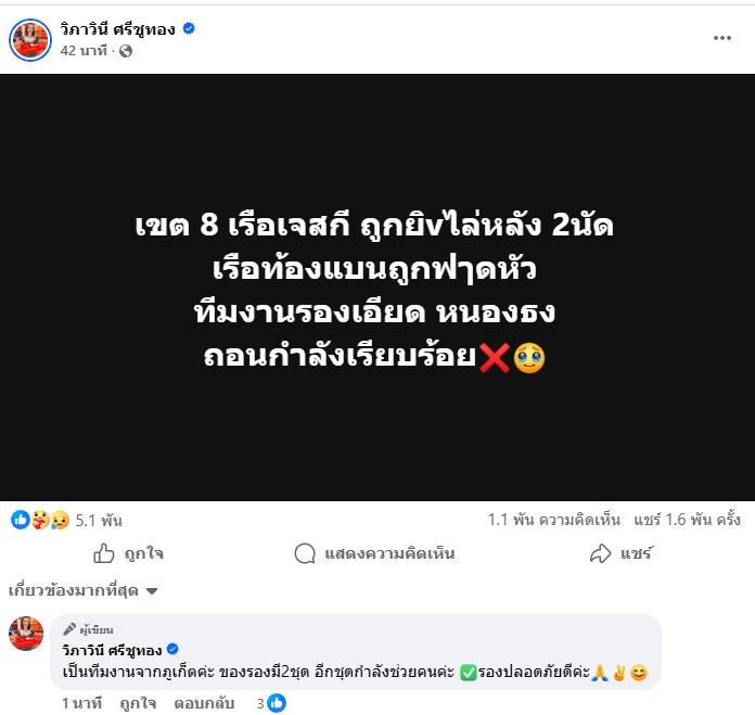 นอกจากนี้ ผู้โพสต์ยังได้คอมเมนต์แจ้งรายละเอียดเพิ่มเติมว่า ทีมงานที่ประสบเหตุเป็นทีมงานจากจังหวัดภูเก็ต โดยชุดช่วยเหลือของรองเอียดยังมีอีก 2 ชุด ซึ่งชุดหนึ่งกำลังปฏิบัติภารกิจช่วยเหลือประชาชนอยู่ในพื้นที่อื่น และยืนยันว่า รองเอียดปลอดภัยดี