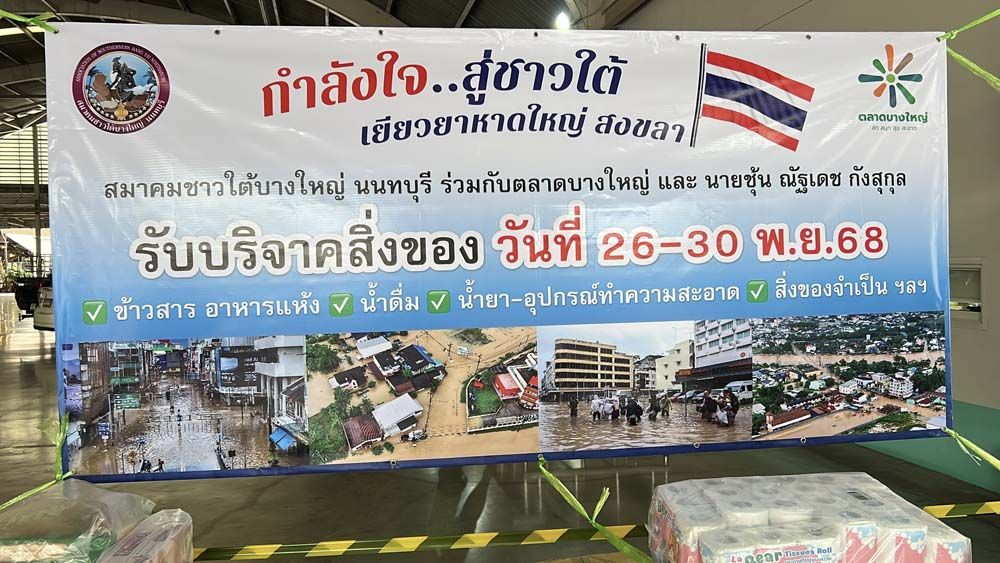 วันที่ 26 พฤศจิกายน 2568 ที่ตลาดบางใหญ่ อ.บางใหญ่ จ.นนทบุรี สมาคมชาวใต้บางใหญ่ จ.นนทบุรี ร่วมกับตลาดบางใหญ่ โดยนายภักดี ไทยสม นายกสมาคมชาวใต้จังหวัดนนทบุรี นายชุ้น ณัฐเดช กังสุกุล ปลัดจังหวัดนนทบุรี ที่ปรึกษาสมาคมชาวใต้จังหวัดนนทบุรี และ นางบุศรีย์ อังคณะวัฒนา ประธานเจ้าหน้าที่บริหารตลาดกลางบางใหญ่ ได้ร่วมกันตั้งจุดธารน้ำใจ ช่วยภัยน้ำท่วม รับบริจาคสิ่งของ ข้าวสาร อาหารแห้ง ของใช้จำเป็น หรือสมทบทุนเพื่อช่วยเหลือผู้ประสบอุทกภัยภาคใต้ โดยมีประชาชน พ่อค้า แม่ค้า ในตลาดและบริเวณใกล้มาบริจาคสิ่งของเป็นจำนวนมาก