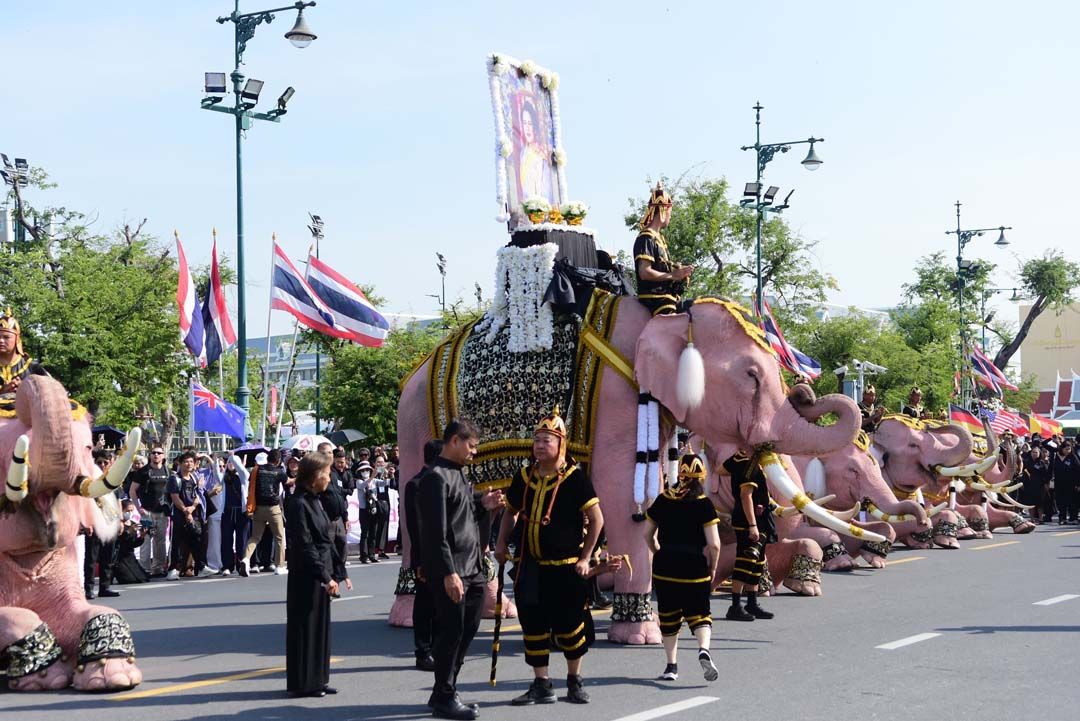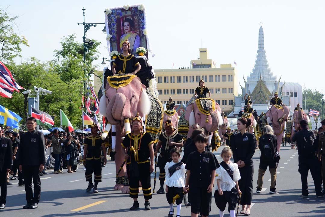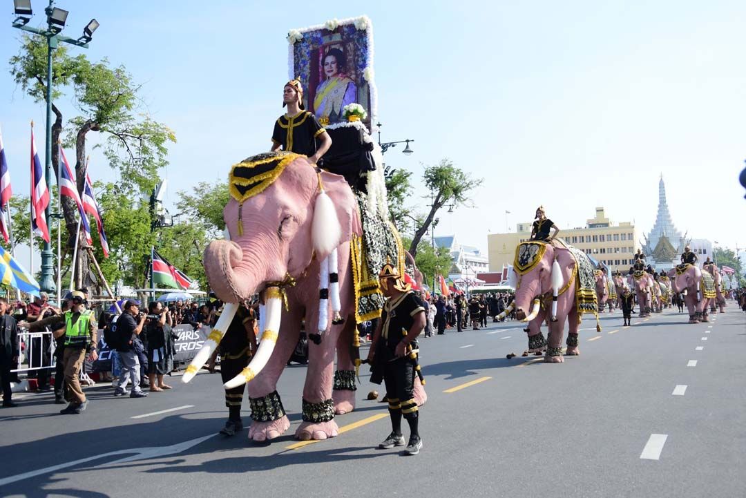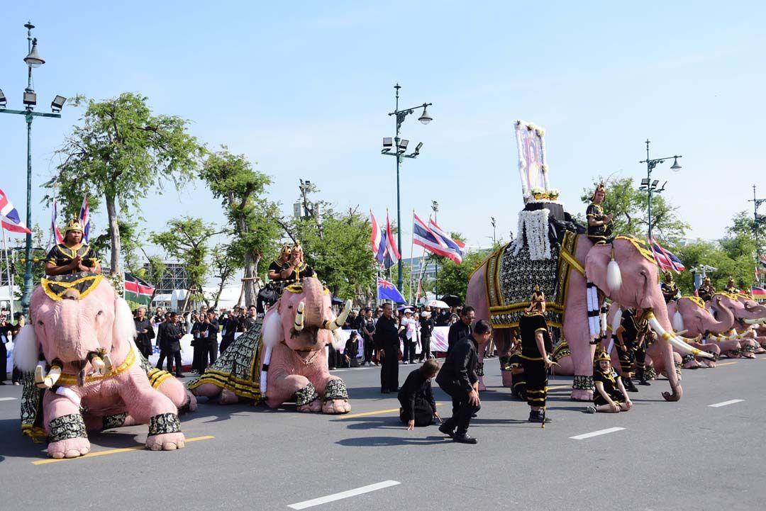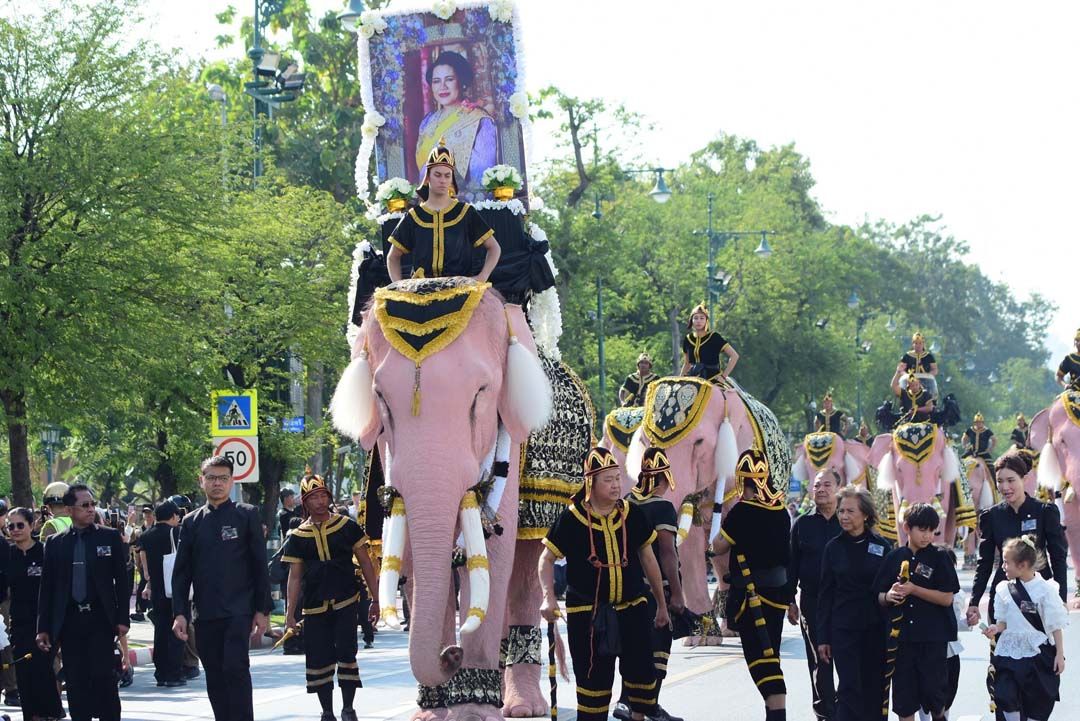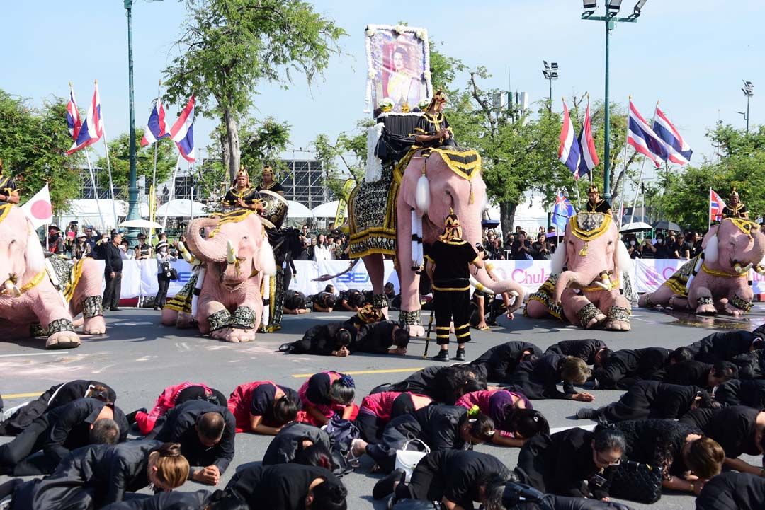 ผู้สื่อข่าวรายงานว่า เมื่อเวลา 09.09 น. กลุ่มคชสารคู่แผ่นดิน และตัวแทนผู้เลี้ยงช้างทั่วประเทศ กว่า 500 คน นำช้าง 11 เชือก จากหมู่บ้านช้างเพนียดหลวง จังหวัดพระนครศรีอยุธยา มาตั้งขบวนที่หน่วยบัญชาการรักษาดินแดน จากนั้นได้เคลื่อนขบวนนำโดย "ช้างพลายสยาม" เดินมายังหน้าประตูมณีนพรัตน์ เพื่อกราบถวายบังคมพระบรมศพสมเด็จพระนางเจ้าสิริกิติ์ พระบรมราชินีนาถ พระบรมราชชนนีพันปีหลวง