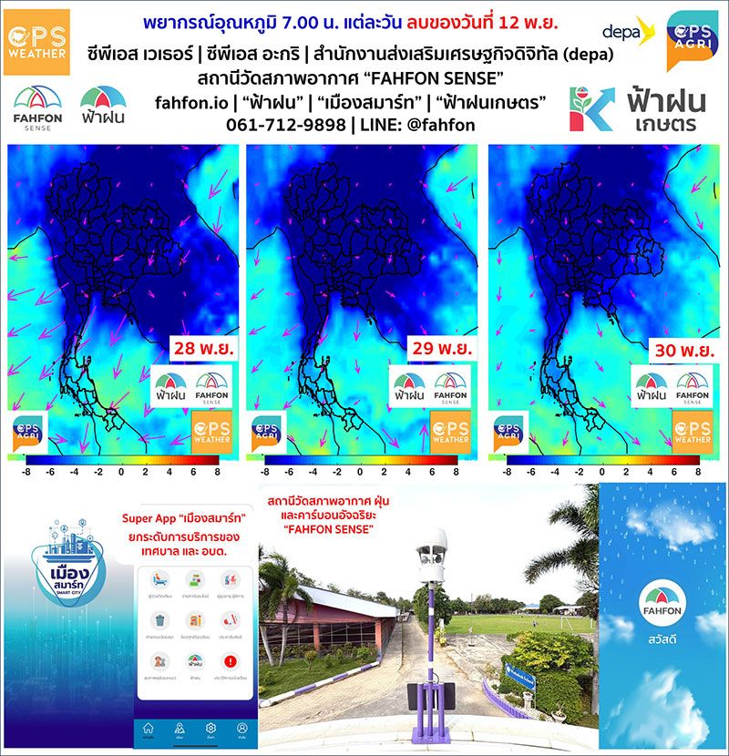 วันที่ 27 พฤศจิกายน 2568 เพจเฟซบุ๊ก "พยากรณ์อากาศประเทศไทย" โพสต์ภาพพยากรณ์อุณภูมิ วันที่ 28 พ.ย.- 30 พ.ย. 2568