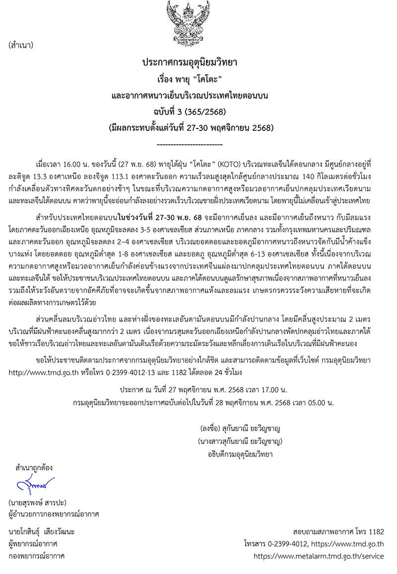 วันที่ 27 พฤศจิกายน 2568 กรมอุตุนิยมวิทยา ประกาศเรื่อง พายุ “โคโตะ”และอากาศหนาวเย็นบริเวณประเทศไทยตอนบน ฉบับที่ 3 (365/2568) (มีผลกระทบตั้งแต่วันที่ 27-30 พฤศจิกายน 2568)
