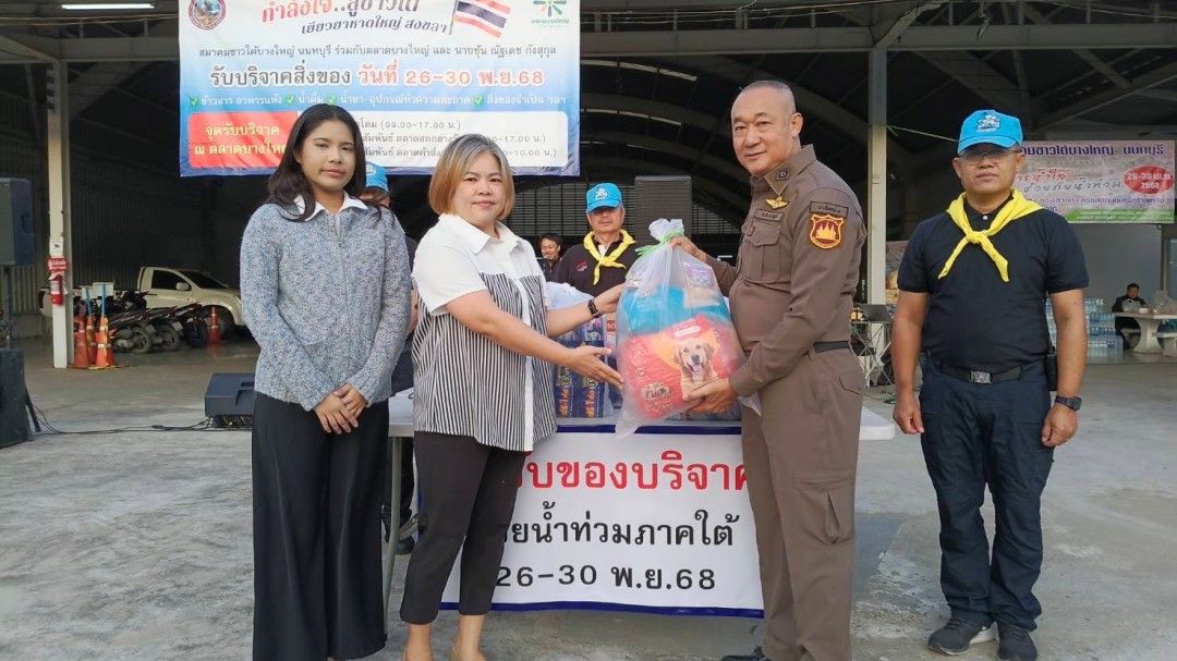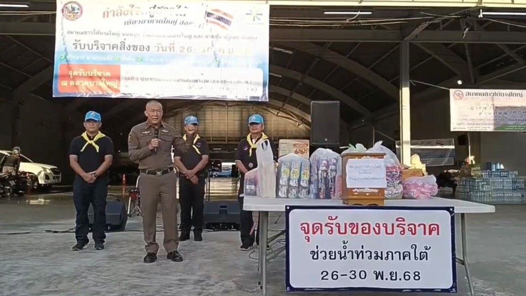 วันที่ 29 พฤศจิกายน 2568 ที่บริเวณโดมอเนกประสงค์ ตลาดบางใหญ่ จังหวัดนนทบุรี พ.ต.อ.สิรภพ อนุศิริ ผกก.สภ.บางใหญ่ ได้ร่วมกับผู้ประกอบการตลาดบางใหญ่ จัดตั้งจุดรับบริจาคสิ่งของเพื่อช่วยเหลือผู้ประสบอุทกภัยในพื้นที่ภาคใต้