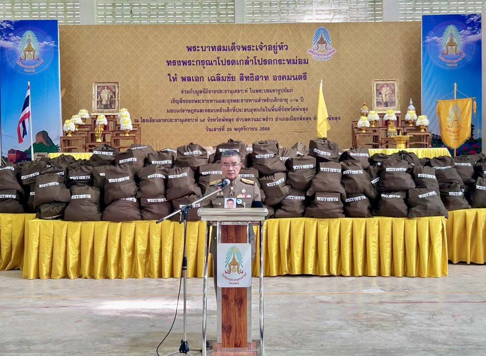วันที่ 29 พฤศจิกายน 2568 เวลา 13.30 น. น. พระบาทสมเด็จพระเจ้าอยู่หัว ทรงพระกรุณาโปรดเกล้า โปรดกระหม่อมให้ พลเอกเฉลิมชัย สิทธิสาท องคมนตรี ร่วมกับมูลนิธิราชประชานุเคราะห์ ในพระบรมราชูปถัมภ์ เชิญถุงพระราชทานและเครื่องอุปโภคบริโภค จำนวน 3,500 ถุง และเชิญถุงพระราชทานสำหรับเด็ก จำนวน 100 ถุง โดยบรรจุสิ่งของเครื่องใช้สำหรับเด็กเป็นพิเศษ ประกอบด้วย ตุ๊กตาผ้าห่ม เป้อุ้มเด็ก นมผง อาหารเด็ก ผ้าอ้อมสำเร็จรูป สำลี ฟองน้ำเช็ดตัว ผลิตภัณฑ์ทำความสะอาด และผลิตภัณฑ์ซักล้างสำหรับเด็ก รวมทั้งสิ่งของที่จำเป็นสำหรับเด็ก โดยมอบแก่ผู้ว่าราชการจังหวัด นายอำเภอ ซึ่งเป็นตัวแทนราษฎร เพื่อเชิญไปมอบแก่ราษฎรที่ประสบอุทกภัยในพื้นที่จังหวัดพัทลุงต่อไป และมอบแก่ราษฎรอำเภอเมืองพัทลุง ณ หอประชุมโรงเรียนราชประชานุเคราะห์ 65 อำเภอเมืองพัทลุง จังหวัดพัทลุง เพื่อช่วยบรรเทาความเดือดร้อนในเบื้องต้นและเป็นขวัญกำลังใจ