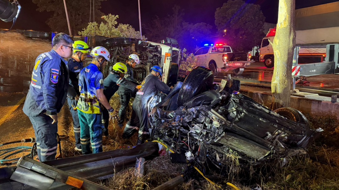 ในที่เกิดเหตุ พบรถบรรทุกน้ำมันขนาดใหญ่ (ไม่ทราบทะเบียน) ชนกับรถกระบะฟอร์ด 4 ประตู สีดำ ป้ายทะเบียนกรุงเทพมหานคร สภาพรถกระบะพังยับเยินทั้งคัน ภายในรถพบผู้เสียชีวิต 1 ราย ทราบชื่อคือ นายจิรสิน อายุ 29 ปี