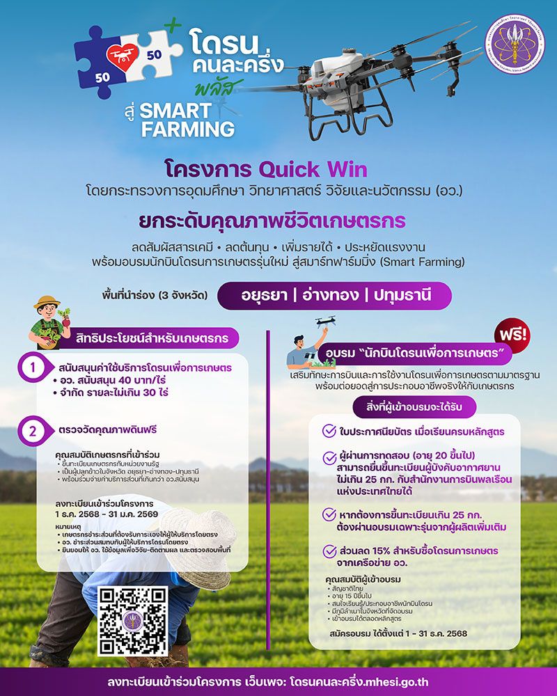 “สุรศักดิ์” คิกออฟโครงการ “โดรนคนละครึ่งพลัส สู่สมาร์ทฟาร์มมิ่ง” กร่ะทรวง อว.ช่วยจ่าย 40 บาทต่อไร่! แบ่งเบาภาระเกษตรกร - ชาวนานำร่องใน 3 จังหวัด “อยุธยา - อ่างทอง - ปทุมธานี” 1 แสนไร่แถมตรวจวัดคุณภาพดิน - จัดอบรมนักบินโดรนฟรี! เปิดให้ลงทะเบียนแล้วสำหรับผู้มีที่นาไม่เกิน 30 ไร่ ไม่ว่าจะเป็นเจ้าของที่นาหรือเป็นผู้เช่านา ตั้งแต่วันนี้ถึง 31 ม.ค.69