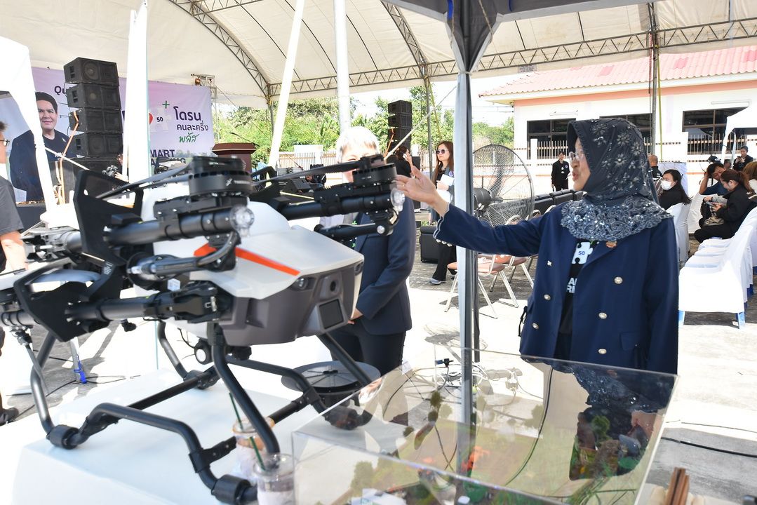 จากนั้น นายสุรศักดิ์ ได้มอบหมายให้นายพิษณุ พลธี ที่ปรึกษา รมว.กระทรวง อว. พญ.เพชรดาว โต๊ะมีนา ผู้ช่วย รมต.กระทรวง อว. น.ส.พิมพ์พร ชีวานันท์ เลขานุการ รมว.กระทรวง อว.ร่วมกันกล่าวเปิดงาน โดยนายพิษณุ กล่าวว่า “โดรนคนละครึ่งพลัส สู่สมาร์ทฟาร์มมิ่ง” เป็นโครงการสำคัญของกระทรวง อว. ซึ่งจะเป็นประโยชน์กับเกษตรกรและพี่น้องประชาชนโดยตรง เพื่อยกระดับคุณภาพชีวิตเกษตรกร เพิ่มประสิทธิภาพเพิ่มรายได้และลดต้นทุนการผลิต ทั้งยังช่วยประหยัดเวลาและแรงงานในการทำงาน เช่น การฉีดพ่นสารเคมี, การให้ปุ๋ย, หรือการหว่านเมล็ด ที่สำคัญเป็นการลดการใช้สารเคมีและปุ๋ยเนื่องจากการควบคุมที่แม่นยำ ทำให้สามารถประเมินและจัดการการใช้ได้อย่างคุ้มค่ามากขึ้น ส่งผลให้คุณภาพและปริมาณของผลผลิตเพิ่มขึ้นและสามารถเข้าถึงพื้นที่เพาะปลูกที่ยากลำบาก เช่น พื้นที่ลาดชันหรือมีอุปสรรค ที่สำคัญเหนือสิ่งอื่นใดโครงการนี้จะช่วยลดความเสี่ยงด้านสุขภาพ เพราะเกษตรกรไม่ต้องสัมผัสสารเคมีโดยตรง ทำให้ลดความเสี่ยงในการเกิดปัญหาสุขภาพระยะยาว เช่น มะเร็ง หรืออาการแพ้ต่างๆ