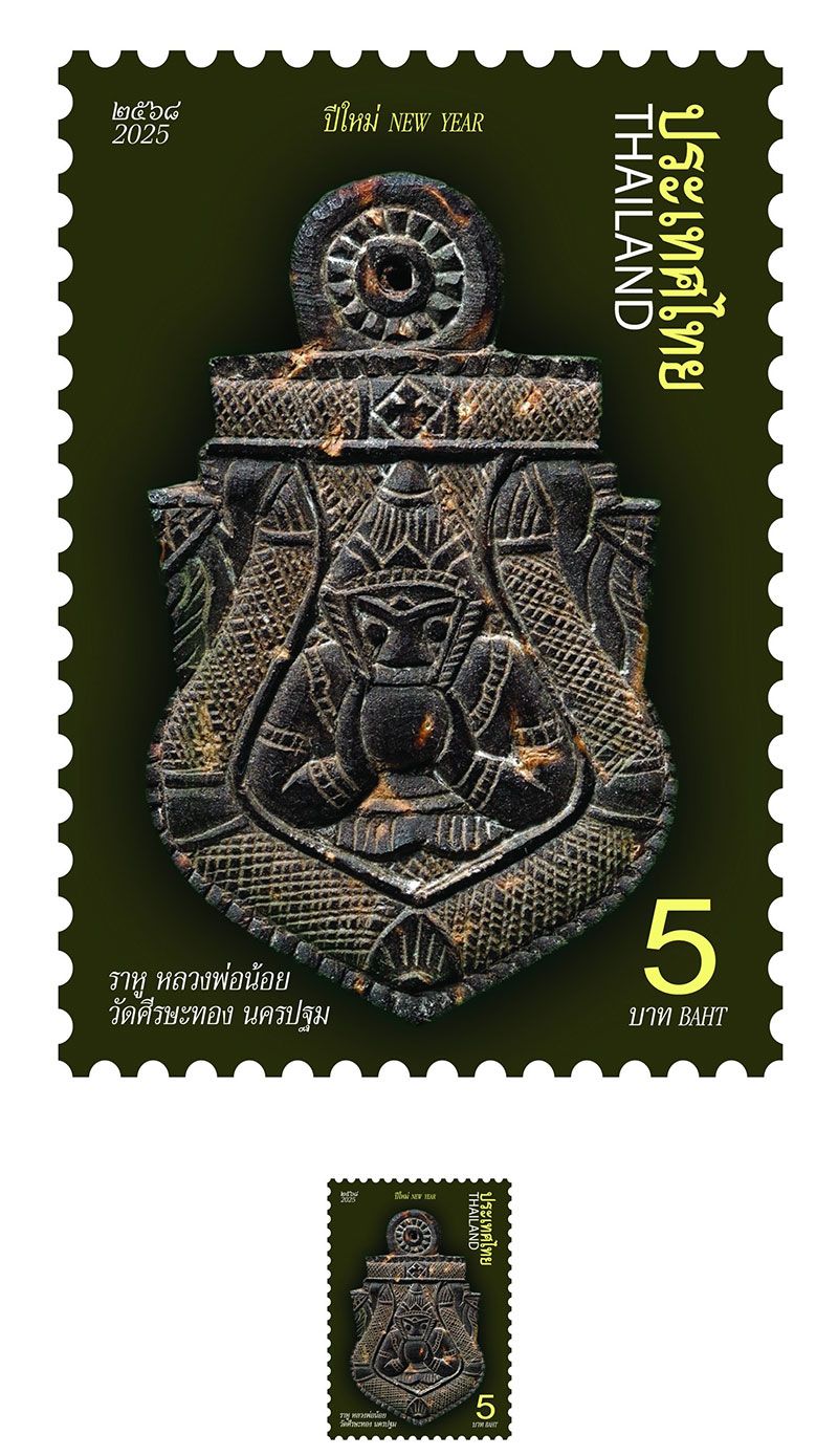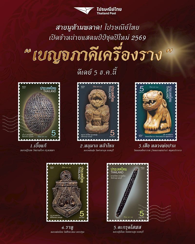 4 ธันวาคม 2568 บริษัท ไปรษณีย์ไทย จำกัด ออกตราไปรษณียากรชุดปีใหม่ 2569 “ภาพเบญจภาคีเครื่องราง” เดินหน้ายกระดับแสตมป์ไทยส่งต่อความมงคลที่เข้าถึงได้แห่งศิลปวัฒนธรรมสร้างคุณค่าทางจิตใจและศรัทธาเชิงเศรษฐกิจ ผ่านเบญจภาคีเครื่องราง 5 ของขลังไทยระดับตำนาน ได้แก่ เบี้ยแก้ หนุมาน เสือ ราหูกะลาแกะ และตะกรุดมหาโสฬส โดยแสตมป์จำหน่ายราคาดวงละ 5 บาท เต็มแผ่น 20 ดวง 100 บาท ซองวันแรกจำหน่าย ราคา 61 บาท ผู้สนใจสามารถซื้อได้ที่พิพิธภัณฑ์แสตมป์ไทยสามเสนใน ที่ทำการไปรษณีย์ในกรุงเทพฯ ที่ทำการไปรษณีย์จังหวัด หรือซื้อทางออนไลน์ที่เว็บไซต์ และแอปพลิเคชัน ThailandPostMart ตั้งแต่วันที่ 5 ธันวาคม 2568 เป็นต้นไป