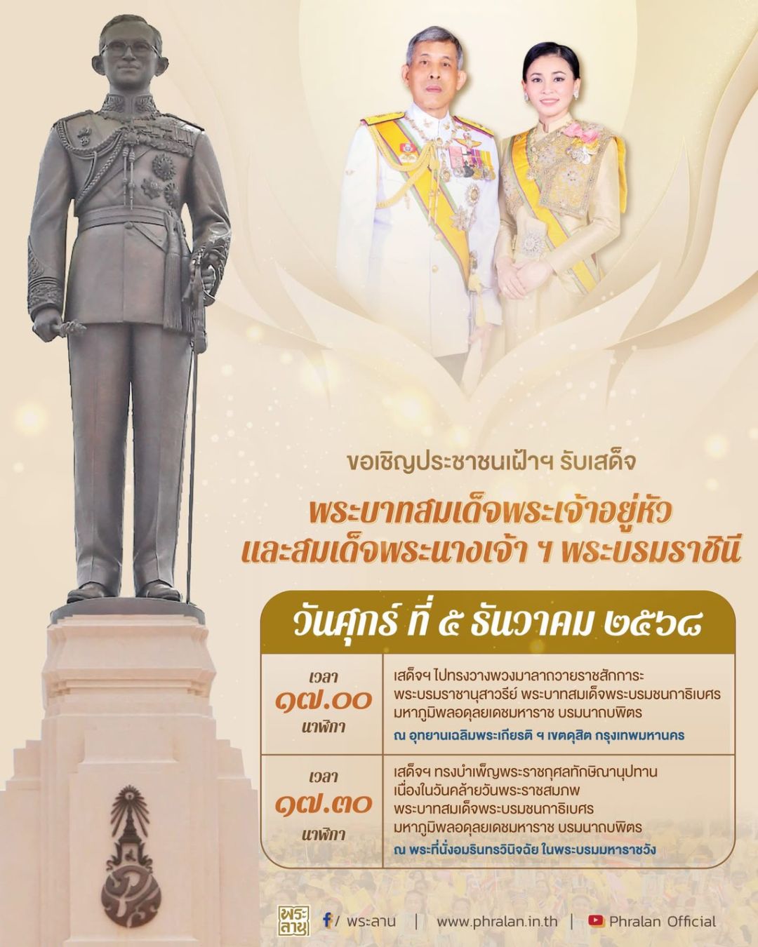 ขอเชิญประชาชนเฝ้าฯ รับเสด็จพระบาทสมเด็จพระเจ้าอยู่หัว และสมเด็จพระนางเจ้า ฯ พระบรมราชินี เสด็จพระราชดำเนินไปทรงวางพวงมาลาถวายราชสักการะพระบรมราชานุสาวรีย์ พระบาทสมเด็จพระบรมชนกาธิเบศร มหาภูมิพลอดุลยเดชมหาราช บรมนาถบพิตร และเสด็จพระราชดำเนินทรงบำเพ็ญพระราชกุศลทักษิณานุปทาน เนื่องในวันคล้ายวันพระบรมราชสมภพ พระบาทสมเด็จพระบรมชนกาธิเบศร มหาภูมิพลอดุลยเดชมหาราช บรมนาถบพิตร วันที่ 5 ธันวาคม 2568