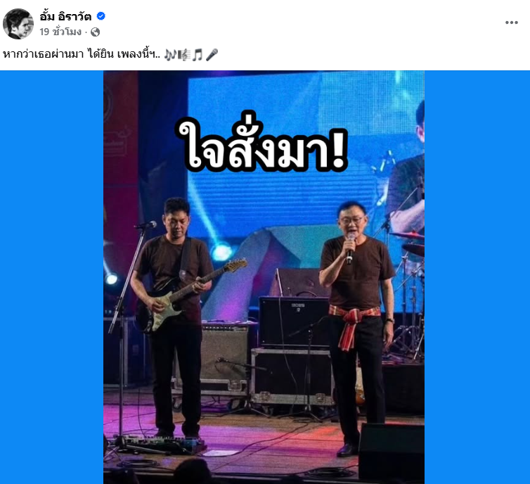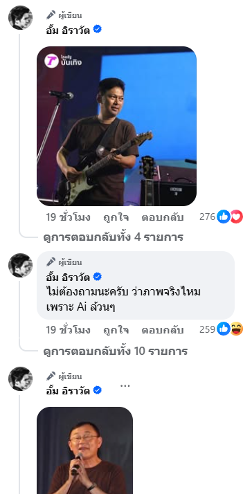 ขณะที่ เฟซบุ๊ก อั้ม อิราวัต ได้โพสต์ภาพดังกล่าวพร้อมระบุแคปชั่นว่า "หากว่าเธอผ่านมา ได้ยิน เพลงนี้" พร้อมยังบอกอีกว่า "ไม่ต้องถามนะครับ ว่าภาพจริงไหม เพราะ Ai ล้วนๆ "