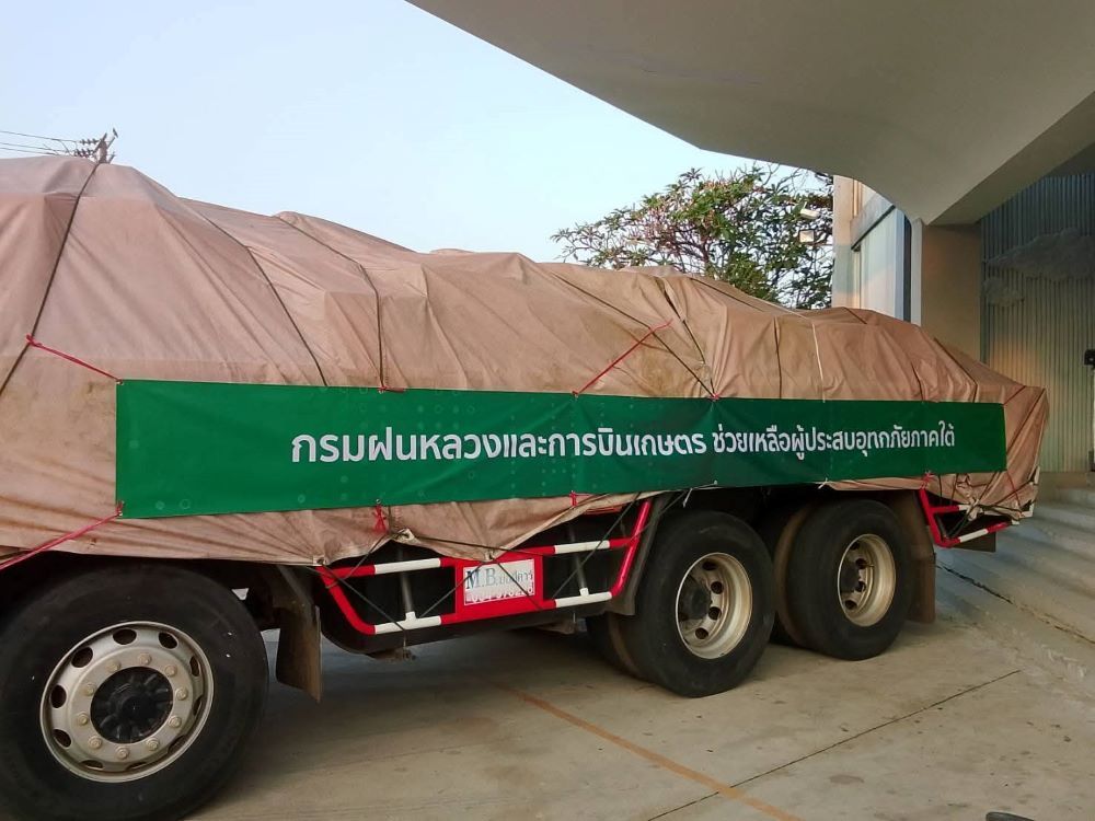 นายราเชน ศิลปะระยะ อธิบดีกรมฝนหลวงและการบินเกษตร เปิดเผยว่าได้สั่งการให้จัดรถบรรทุกลำเลียงถุงยังชีพทั้งหมด เดินทางสู่จังหวัดสงขลาเพื่อกระจายความช่วยเหลือให้ถึงมือประชาชนอย่างรวดเร็ว พร้อมมอบหมายให้ นายสมศักดิ์ อิศรางกูร ณ อยุธยา ผู้อำนวยการกองบริหารการบินเกษตร เป็นผู้แทนกรมฯ เดินทางไปมอบสิ่งของบรรเทาทุกข์ให้แก่ผู้ประสบภัยในพื้นที่ด้วยตนเอง