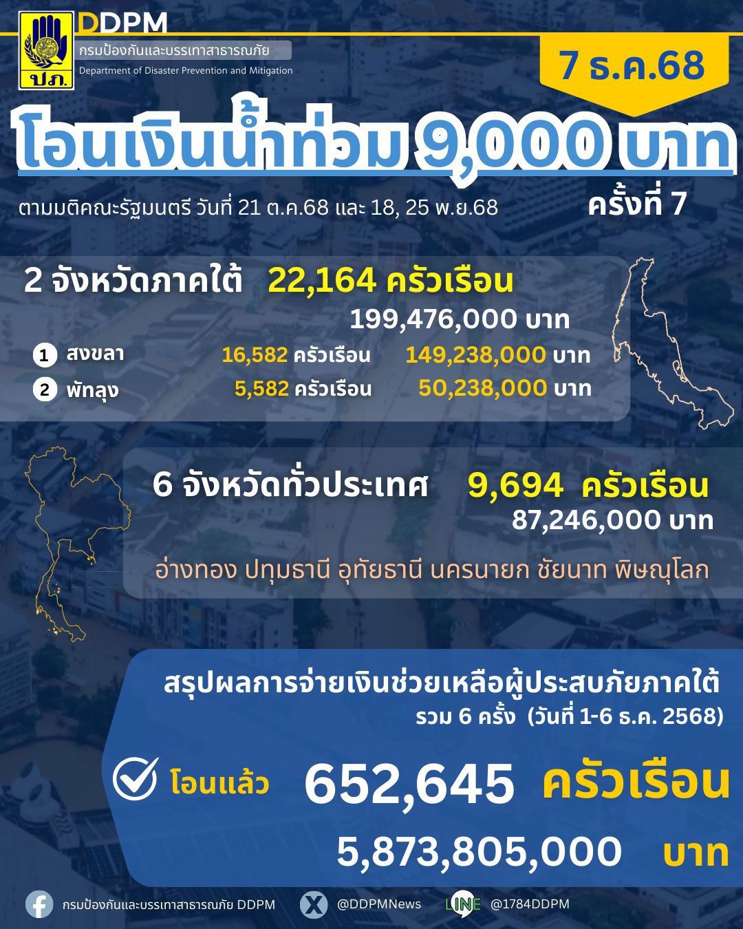 โดยตั้งแต่วันที่ 1 ธ.ค.68 จนถึงปัจจุบัน ปภ.และธนาคารออมสิน ได้โอนเงินเยียวยาผู้ประสบภัยใน 9 จังหวัดภาคใต้ ไปแล้วกว่า 652,645 ครัวเรือน รวมเป็นเงินทั้งสิ้น 5,873,805,000 บาท