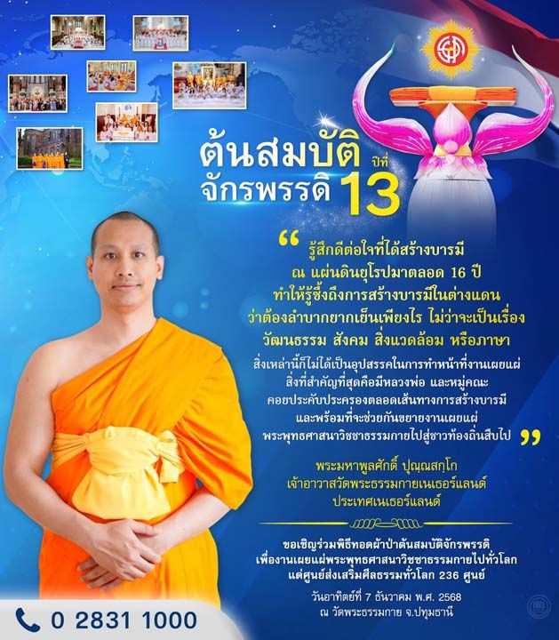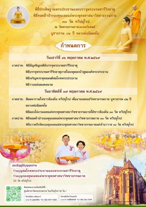 พิธีประดิษฐานพระประธานและบรรจุพระบรมสารีริกธาตุ : ก้าวสู่ปีที่ 10 กับงานบุญ “พิธีประดิษฐานพระประธานและบรรจุพระบรมสารีริกธาตุ” และพิธีทอดผ้าป่ากองทุนเผยแผ่พระพุทธศาสนาวิชชาธรรมกาย 30 วัด ทวีปยุโรป บูชาธรรม 82 ปี หลวงพ่อธัมมชโย ซึ่งจะจัดขึ้นในวันที่ 16 และ 17 พฤษภาคม พ.ศ. 2569 โดยมีคุณไพศาล ทวีชัยถาวร และคุณเสาวนี หิรัณยศิริ ให้เกียรติเป็นประธานในพิธี ฯ ทั้งนี้ ขอเชิญชวนพุทธศาสนิกชน ร่วมบุญสมโภชพระประธานและพระบรมสารีริกธาตุ และร่วมบุญกองทุนเผยแผ่พระพุทธศาสนาวิชชาธรรมกาย 30 วัด ทวีปยุโรป โดยติดต่อสอบถามเพิ่มเติมได้ที่ ผู้ประสานงานศูนย์สาขาวัดพระธรรมกาย ในทวีปยุโรป 30 วัด โทร.061-057-7266 และ 081-561-5740 หรือติดตามข่าวสารได้ที่ Facebook : วัดพระธรรมกายเนเธอร์แลนด์ Wat Phra Dhammakaya Netherlands