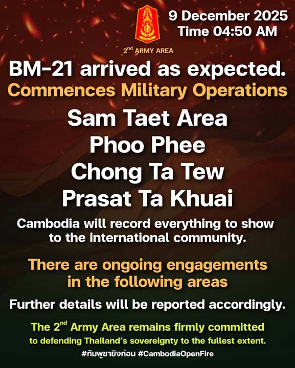 9 ธันวาคม 2568 กองทัพภาคที่ 2 แจ้งว่า BM-21 มาตามนัด เริ่มมีการปฏิบัติทางทหาร พื้นที่ซำแต , ภูผี, ช่องตาเฒ่า, และปราสาทตาควาย กัมพูชาจะถ่ายภาพทุกอย่าง เพื่อฟ้องชาวโลก รับบทเป็นเหยื่อทั้งที่เป็นฝ่ายเริ่มก่อนทุกครั้ง ไทยจำเป็นต้องตอบโต้ตามกฎการปะทะ เพื่อทำให้ภัยคุกคามสิ้นสภาพการรบ และรักษาความปลอดภัยในชีวิตและทรัพย์สินของประชาชนในพื้นที่ชายแดน