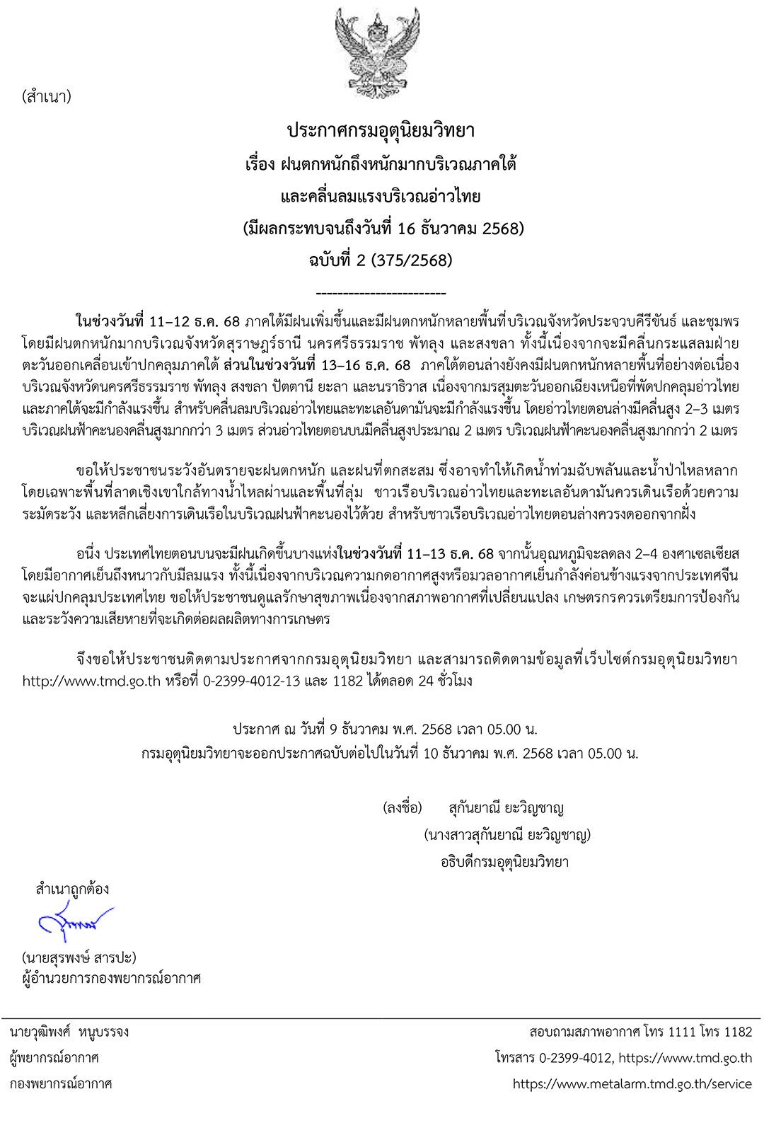 เมื่อเวลา 05.00 น.วันที่ 9 ธันวาคม 2568 กรมอุตุนิยมวิทยา ประกาศเรื่อง ฝนตกหนักถึงหนักมากบริเวณภาคใต้ และคลื่นลมแรงบริเวณอ่าวไทย (มีผลกระทบจนถึงวันที่ 16 ธันวาคม 2568) ฉบับที่ 2 (375/2568) ดังนี้