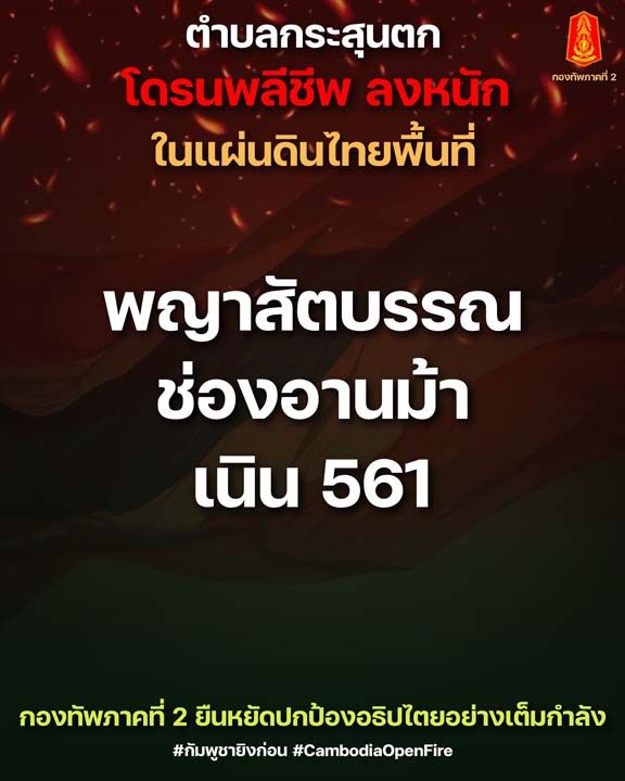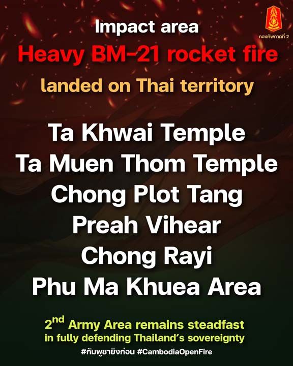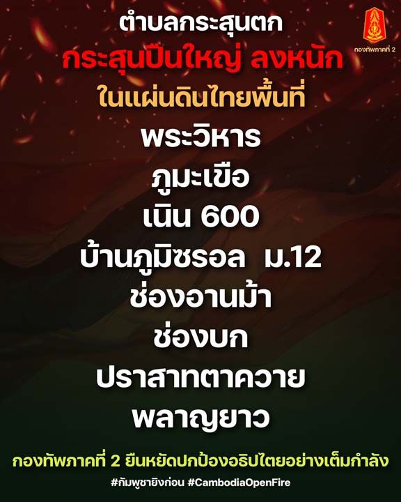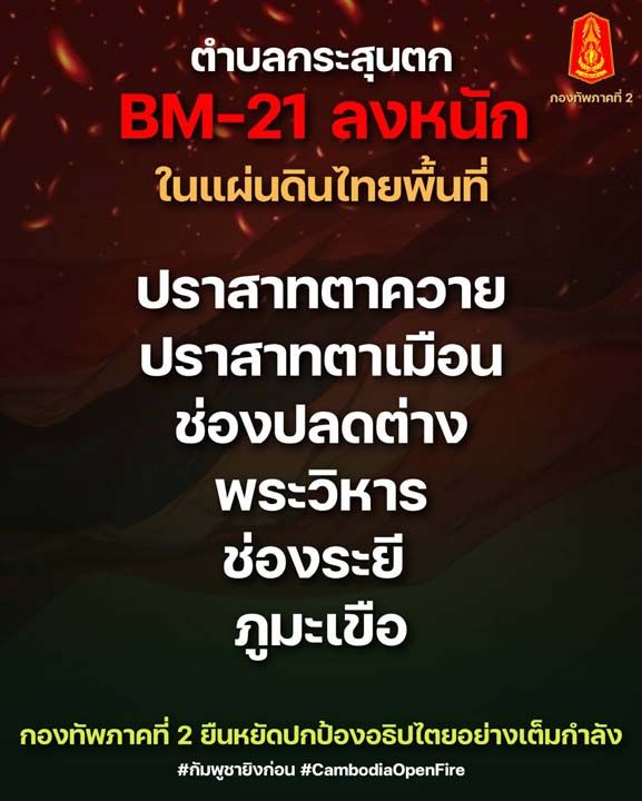 เมื่อเวลาประมาณ 09.00 น.วันที่ 9 ธันวาคม 2568 กองทัพภาคที่ 2 รายงานสถานการณ์ชายแดนไทย-กัมพูชา พบว่า ฝั่งกัมพูชาโจมตีรุกรานฝ่ายไทยด้วย ปืนใหญ่ , BM-21 และโดรนพลีชีพ อย่างหนัก ระบุว่า...