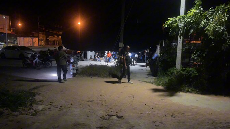 ขณะที่บรรยากาศช่วงค่ำ ชุด ชรบ.พื้นที่ได้แบ่งกำลังออกตรวจสอบดูแลความเรียบร้อยให้กับชาวบ้านที่อพยพออกไปอยู่ยังศูนย์พักพิง เพื่อเช็คว่ามีบ้านหลังที่ลืมปิดล็อคบ้านหรือลืมล็อครถ ป้องกันเหตุลักขโมยทรัพย์สินชาวบ้าน โดยมีการออกตรวจตราทุก 2 ชั่วโมง ท่ามกลางเสียงปืนใหญ่ของไทยที่ยิงกดดันแนวรบตามหลักยุทธวิธีทางการทหารอย่างต่อเนื่อง หลังพบว่ามีการเคลื่อนไหวของกองกำลังทหารฝั่งกัมพูชาพร้อมยุทโธปกรณ์ตั้งแต่ช่วงบ่าย สามารถมองเห็นแสงกระสุนพุ่งแหวกบนท้องฟ้าในยามค่ำคืนเดือนหงายอย่างชัดเจน
