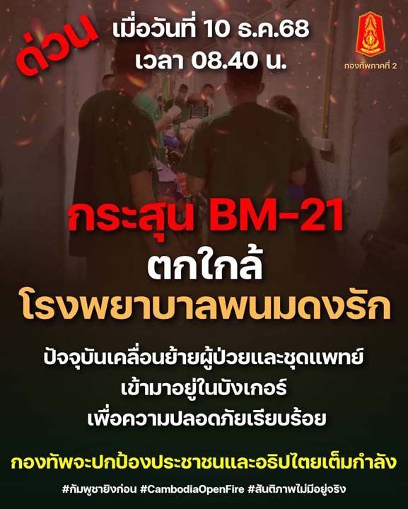 10 ธันวาคม 2568 กองทัพภาคที่ 2 รายงานสถานการณ์สู้รบชายแดนไทยกัมพูชา ในเวลา 08.40 น.วันนี้ (10 ธ.ค.68) กัมพูชายิง BM-12 ตกใกล้โรงพยาบาลพนมดงรัก จังหวัดสุรินทร์ ปัจจุบันได้เคลื่อนย้ายผู้ป่วย บุคลากรทางการแพทย์เข้ามาอยู่ในบังเกอร์ เพื่อความปลอดภัยเรียบร้อยแล้ว