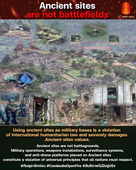 กองทัพภาคที่ 2 ขอเรียกร้องให้ฝ่ายกัมพูชาหยุดใช้โบราณสถานในการเป็นฐานทางทหาร เพราะ โบราณสถานไม่ใช่สนามรบ การปฏิบัติการทางทหาร การติดตั้งอาวุธ กล้องตรวจการณ์ และระบบแอนตี้โดรนบนพื้นที่มรดกโลก ถือเป็นการละเมิดหลักสากลที่ทุกประเทศต้องเคารพ ตามกฎกติกาสากลโลก