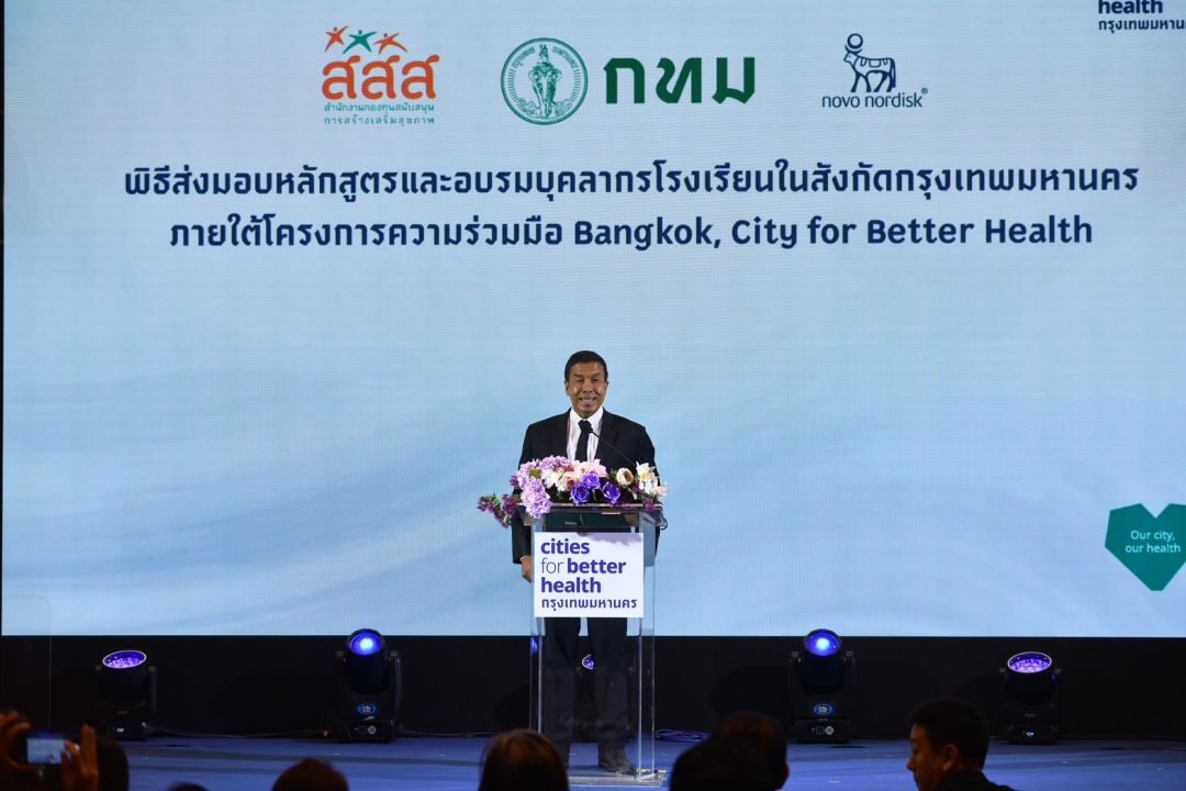 กรุงเทพมหานคร โดยสำนักการศึกษา จัดพิธีส่งมอบหลักสูตรและอบรมบุคลากรโรงเรียนสังกัดกรุงเทพมหานคร ภายใต้โครงการความร่วมมือ Bangkok, City for Better Health ตามที่กรุงเทพมหานครร่วมกับสถานเอกอัครราชทูตราชอาณาจักรเดนมาร์กประจำประเทศไทย และบริษัท โนโว นอร์ดิสค์ ฟาร์มา (ประเทศไทย) จำกัด เพื่อส่งเสริมสุขภาพของประชาชนในเมืองอย่างยั่งยืน ผ่านการปรับปรุงสภาพแวดล้อม วิถีชีวิต และนโยบายสาธารณะ กิจกรรมภายใต้โครงการฯ คือ การจัดทำแผนการจัดการเรียนการสอนและหลักสูตร “อย่าปล่อยให้เด็กอ้วน” ซึ่งเป็นหลักสูตรที่สอดคล้องกับจุดเน้นของกรุงเทพมหานคร และสนับสนุนเป้าหมายการพัฒนาที่ยั่งยืน (SDGs) เป้าหมายที่ 3 การสร้างหลักประกันสุขภาพที่ดีและส่งเสริมความเป็นอยู่ที่ดีสำหรับทุกคนในทุกช่วงวัย