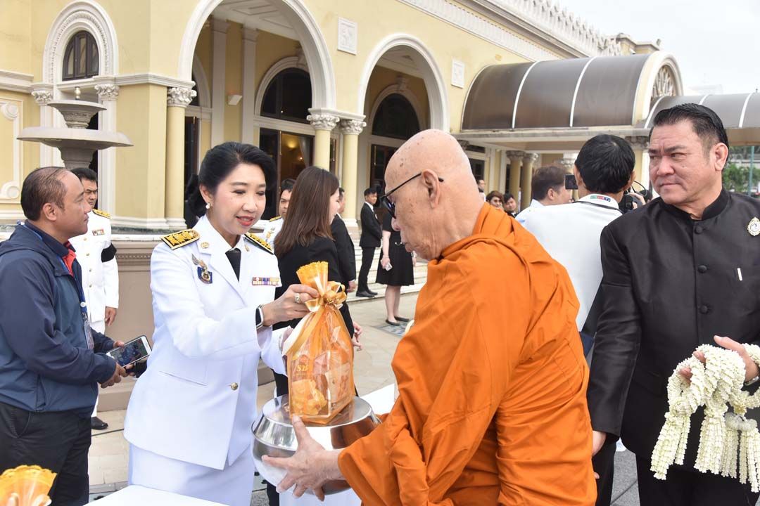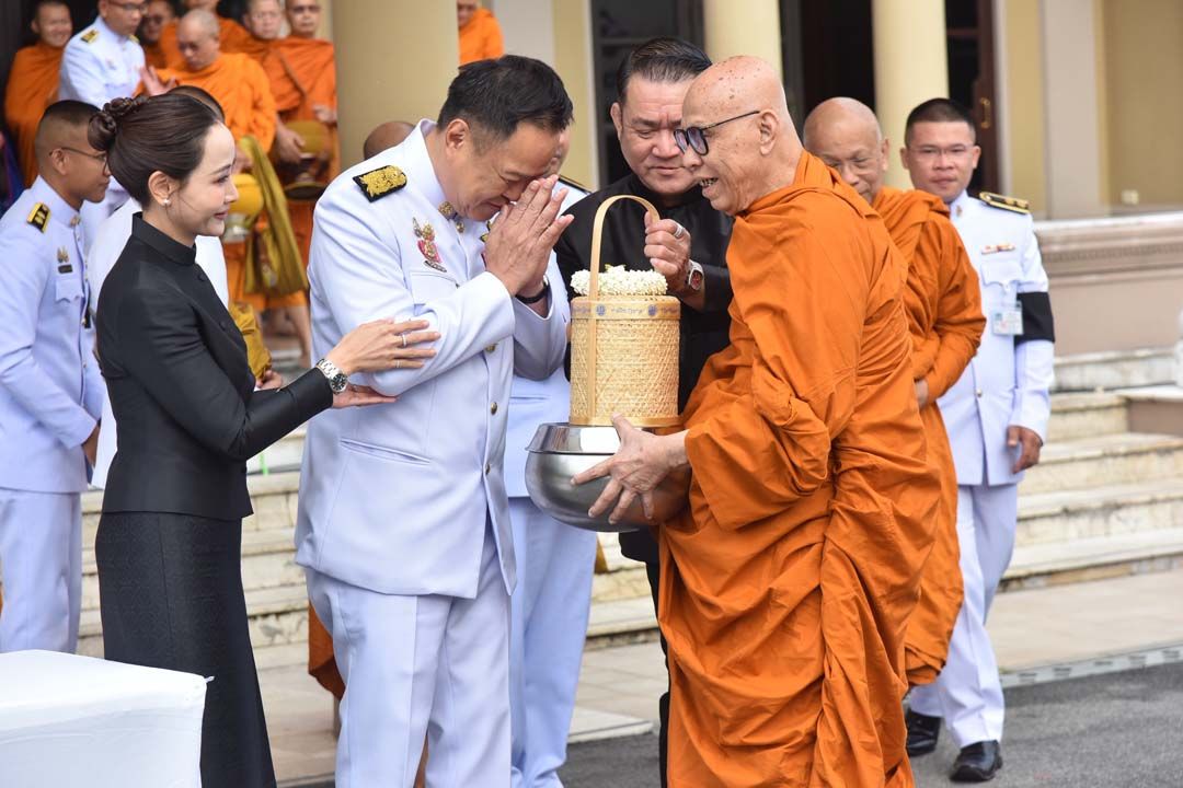 จากนั้น เวลา 08.00 น.นายกรัฐมนตรี และนางสาวธนนนท์ นิรามิษ พร้อมด้วยคณะรัฐมนตรี หัวหน้าส่วนราชการในสังกัดสำนักนายกรัฐมนตรี หัวหน้าส่วนราชการและรองหัวหน้าส่วนราชการในทำเนียบรัฐบาล ผู้บริหาร ข้าราชการ และเจ้าหน้าที่ของหน่วยงานในทำเนียบรัฐบาล ได้ร่วมใส่บาตรพระสงฆ์ ณ บริเวณด้านหน้าตึกสันติไมตรี